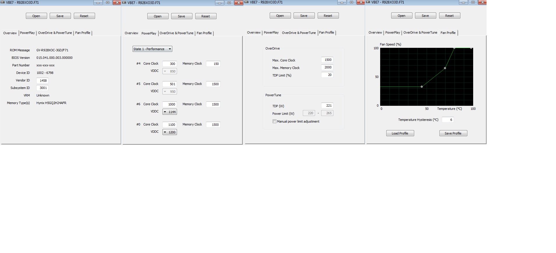 Помогите разогнать SAPPHIRE DUAL-X R9 280X 3GB GDDR5 OC (UEFI), менял и сохранял значения через VBE7.0.0.7b, но после прошивки при заходе в любую 3Д игру она намертво зависает, судя по GPUz частоты сбрасываются до 300 мгц и 150 память. хотя виндоус работает. и ТПД повышал до 270, ничего не помогло. Хочу выставить по ядру 1100( напряжение 1.200), по памяти 1600. Может кто умеет через HEX редактор поможет Мой биос https://yadi.sk/d/0A7-kM6KeLsJa