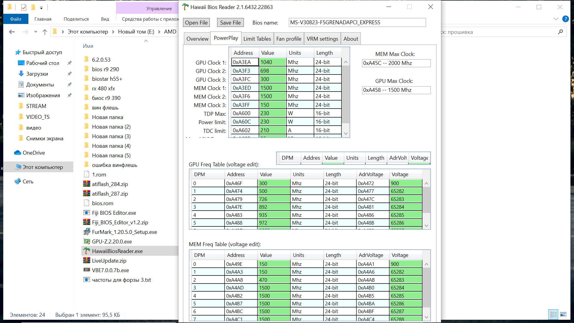 я не об этом, а к тому что коли кто решился понизить напряжение, думаю лучше искать стабильность вольтажом в натуре, ибо точно знаешь сколько чего - видишь "путь" по поводу - "не будут гаваи даже при асике 100% работать нормально на 1040 при 1180V" возможно, оспаривать не буду, потому всегда пишу - нужно искать баланс а не максимальную частоту, ибо несколько лишних мегагерц ничего не дадут, однако возможно именно они находятся за чертой, после которой начинается "обвальное" ухудшение соотношения частота - напряжение (производительность - жор/нагрев) на примере моей карты: особо не ковырял (неохото) но навскидку нащупал баланс - сваял эконом биос (картинка на предыдущей странице) время показало - стабилен