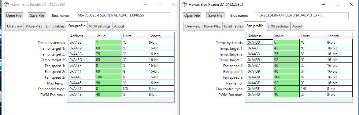 Разобрался, как вдвое раздувается объём файла. Это делает Hawaii Bios Editor. Если заставить его переписать существующий файл, он почему-то становится не 128 Кб, а 256 Кб. Если этим файлом шить карту, она работает, вот только датчик температуры показывает красивую, заниженную температуру. Вот те 63 или 64 градуса, что я на картинке показывал, а по ощущениям, что это не так и есть последствие. На самом деле там далеко за семьдесят. По поводу понижения напряжений. Ведь понятно, что значение имеют только первый и последний. Однако, если GPU питания не хватает, он может запросить старший стейт, хотя он ему и не нужен. В результате, средняя температура карты лишь увеличивается. Это видно в ходе прохождения тестов, когда на каком-то эпизоде GPU нагрет до 72 градусов при указанном напряжении 1,175, а при 1,187 внезапно только 68 градусов. Я не навязываю ничего никому, не спорю. Призываю только понаблюдать. Там всё не так однозначно. По поводу "бублика". У нас тоже есть свой "бублик". Кривая какая-то программа, которая даже запускается только через терминал. Запускается и тут же уходит компьютер в перезагрузку. Не работает и наплевать. Игры бегают - и ладно
