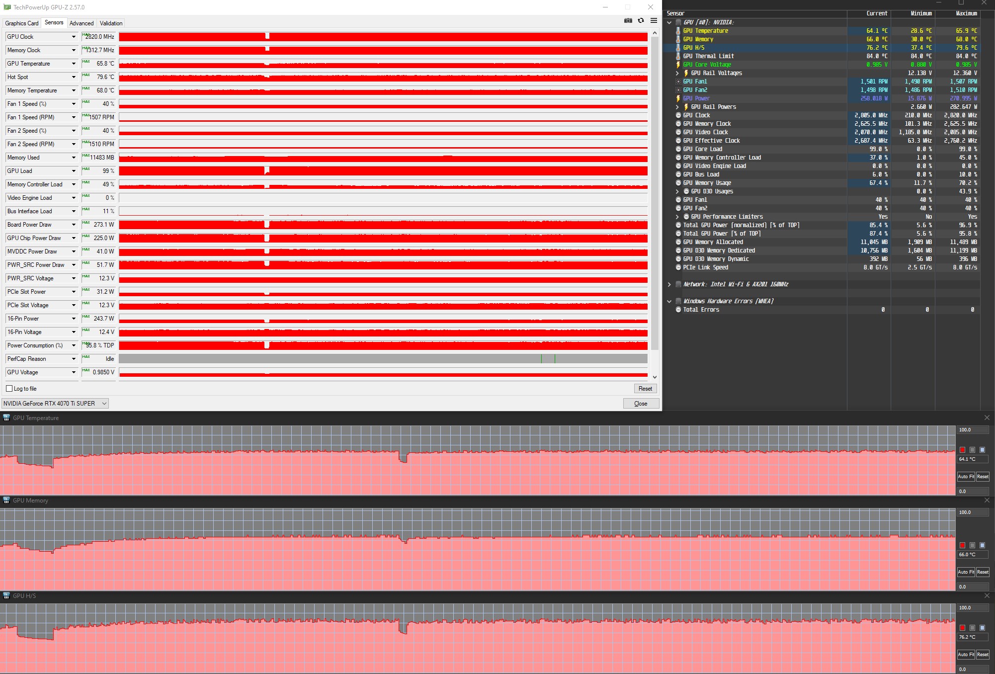 Итого: Пока стабильно КП2077 около часа 2805(2820)@0,985 в среднем 64/76/66 (чип/хотспот/память) при ~255W, вентили залочил на 40%, память сток, PL сток, 24гр. в комнате.