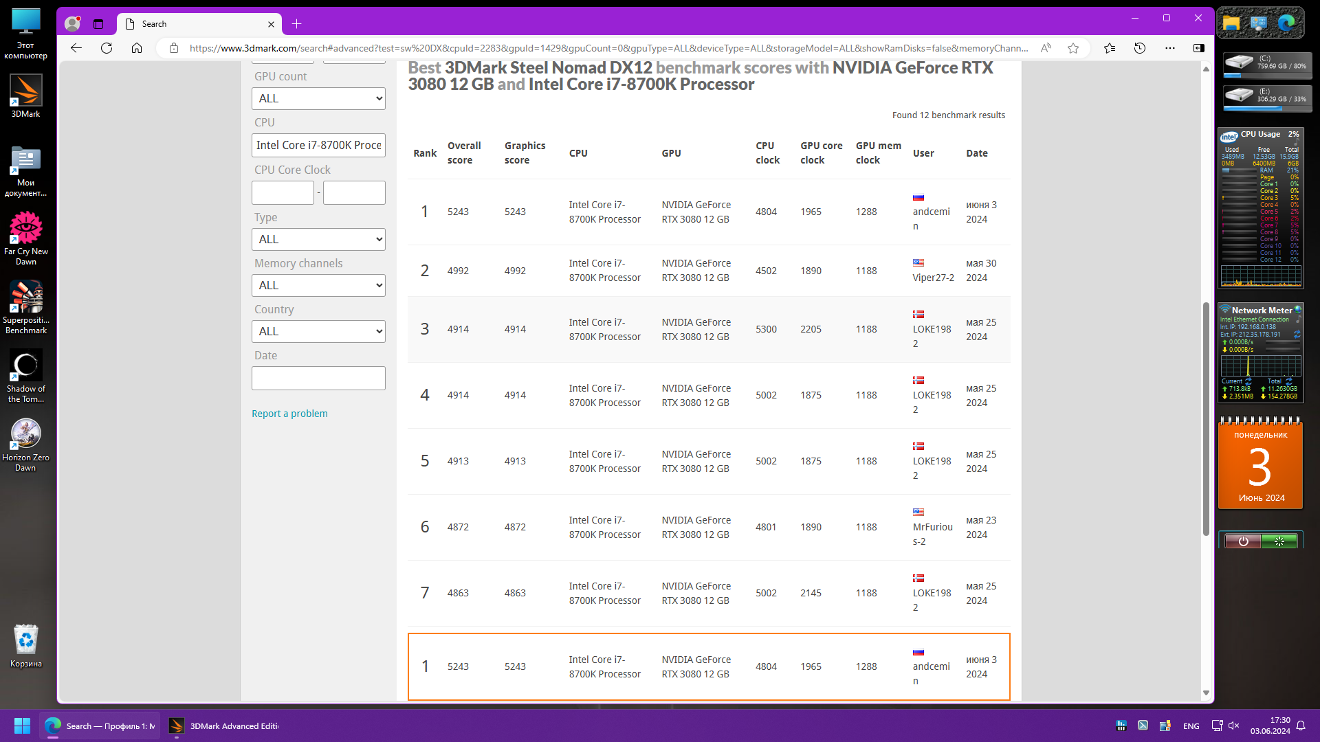 Прикольно, дай думаю новый стил номад из марка пройду, тем более жара сейчас под 29 в комнате. Ну прошел и прошел, только онлайн результаты заработали в отличии когда только вышел, ну и как оказалось мировой рекорд на моем железе, при чем американцы и прочие англы существенно так позади, 250 очков нагнать придется им постараться. https://www.3dmark.com/3dm/112474509