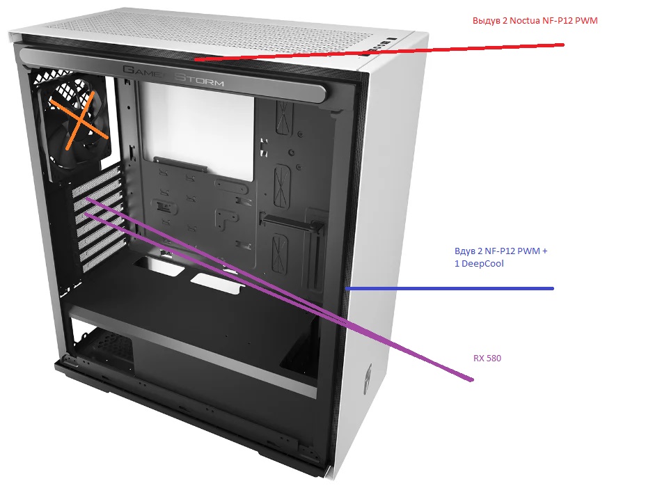на вдув три. Верхний обдувает плашки, ОЗУ. Могу на полную скорость, они тихие 1200об/мин максимум.