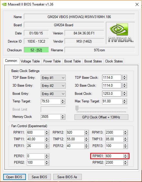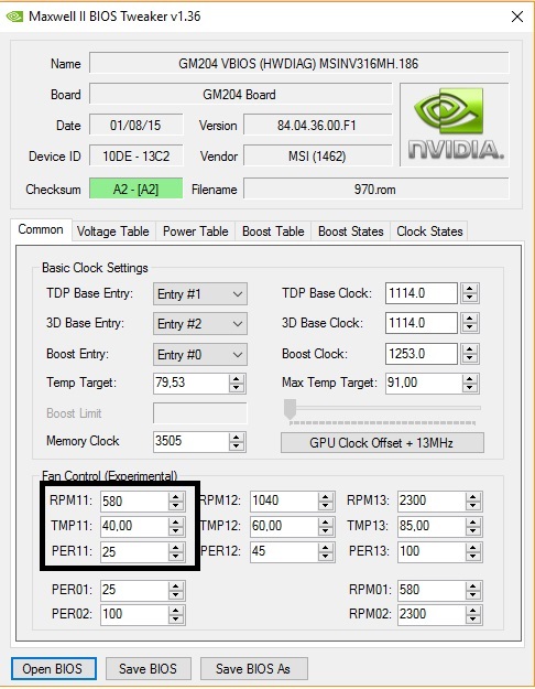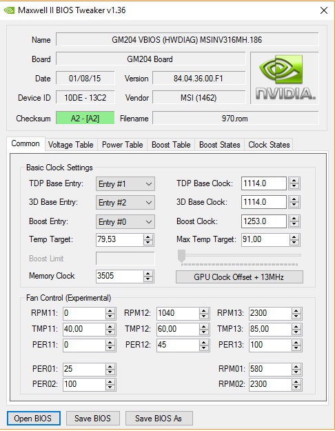 Информация от участника темы: Аффторитет Приведу пример как разгонять карты 970/980/980ti по таблице буст частот. Не буду писать как бекапить/сохранять биос, как и какие ставить поверлимиты - все это есть в шапке темы в инструкции по разгону. Образцом к материалу будет моя MSI GTX970 gamming 100ME. Поиграл я с разгоном в Afterburner-e и решил зашить разгон в биос. Задача разогнать карту бустом до 1506МГц при напруге в 1.231в. Начинаем.