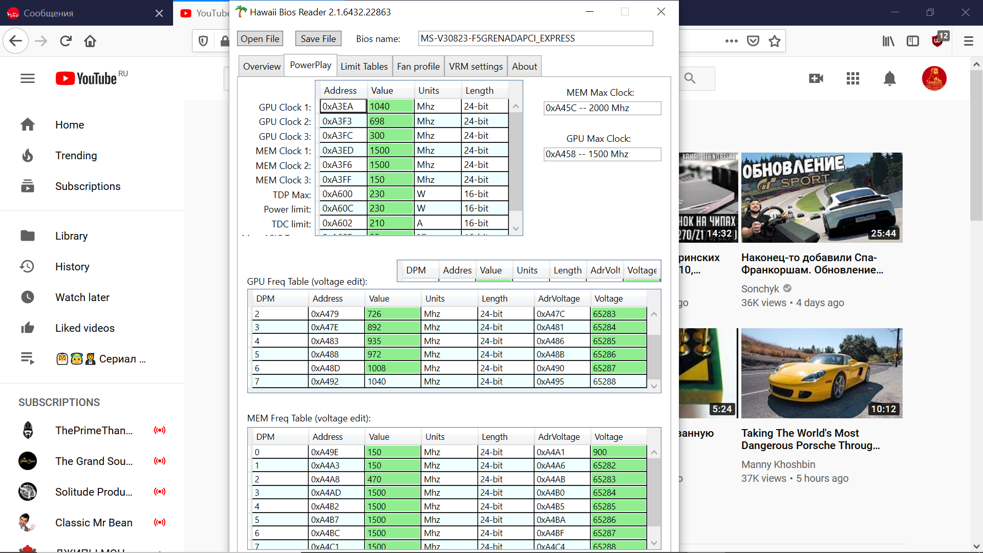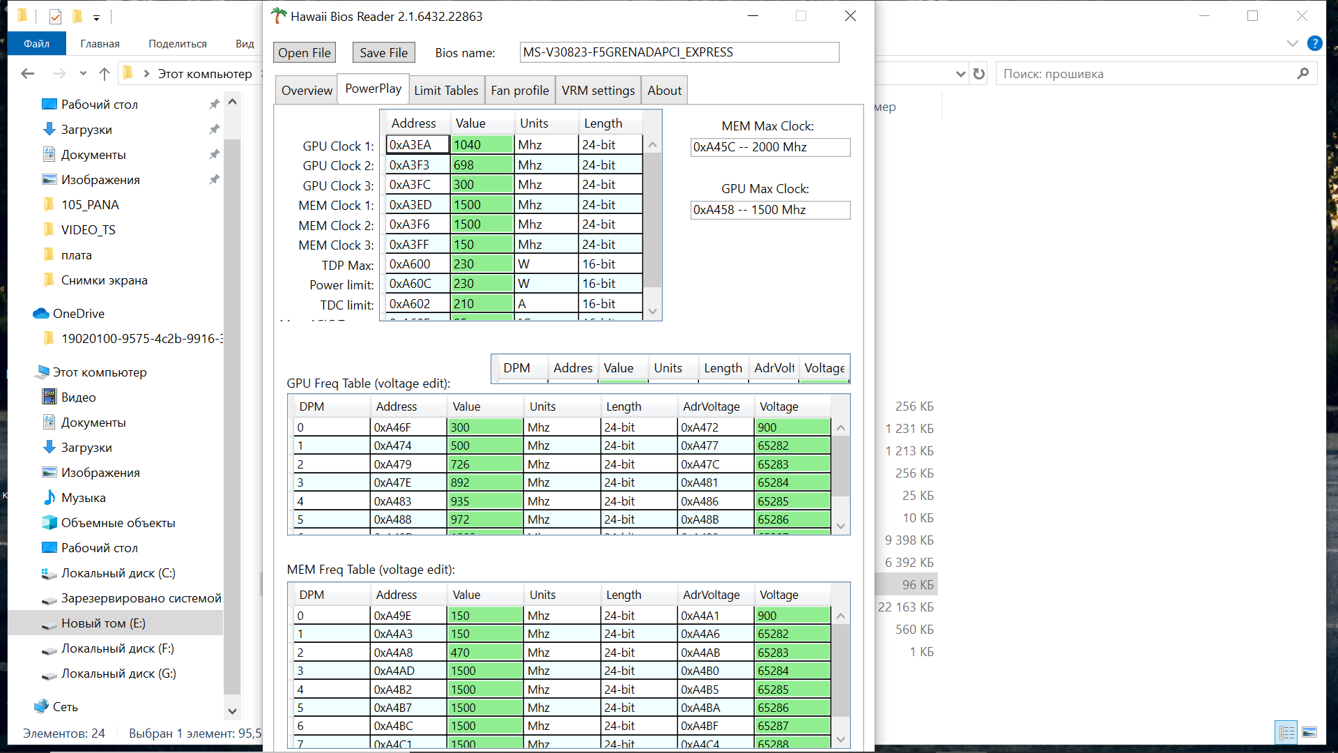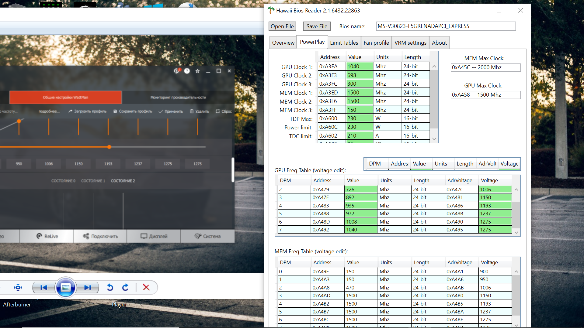 Всемпривет! Купил карту HIS r9 390 ПРи нагрузке бубликом, карта выдает частоту 800-900 мгц. Если поднять поверлимит в афтербернере, тогда только стабилизируется на отметке 1020. Хочу поправить биос, что бы этого не было. Или может, просто залить биос от другой карты? Подскажите, от какой? В гавай-ридер, открыл, но не пойму, какие поля править, что поднять поврелимит. Или какие поля править, что бы опнизить/повысить напряжение ядра. Вкладки PowerPlay и Limit Tables