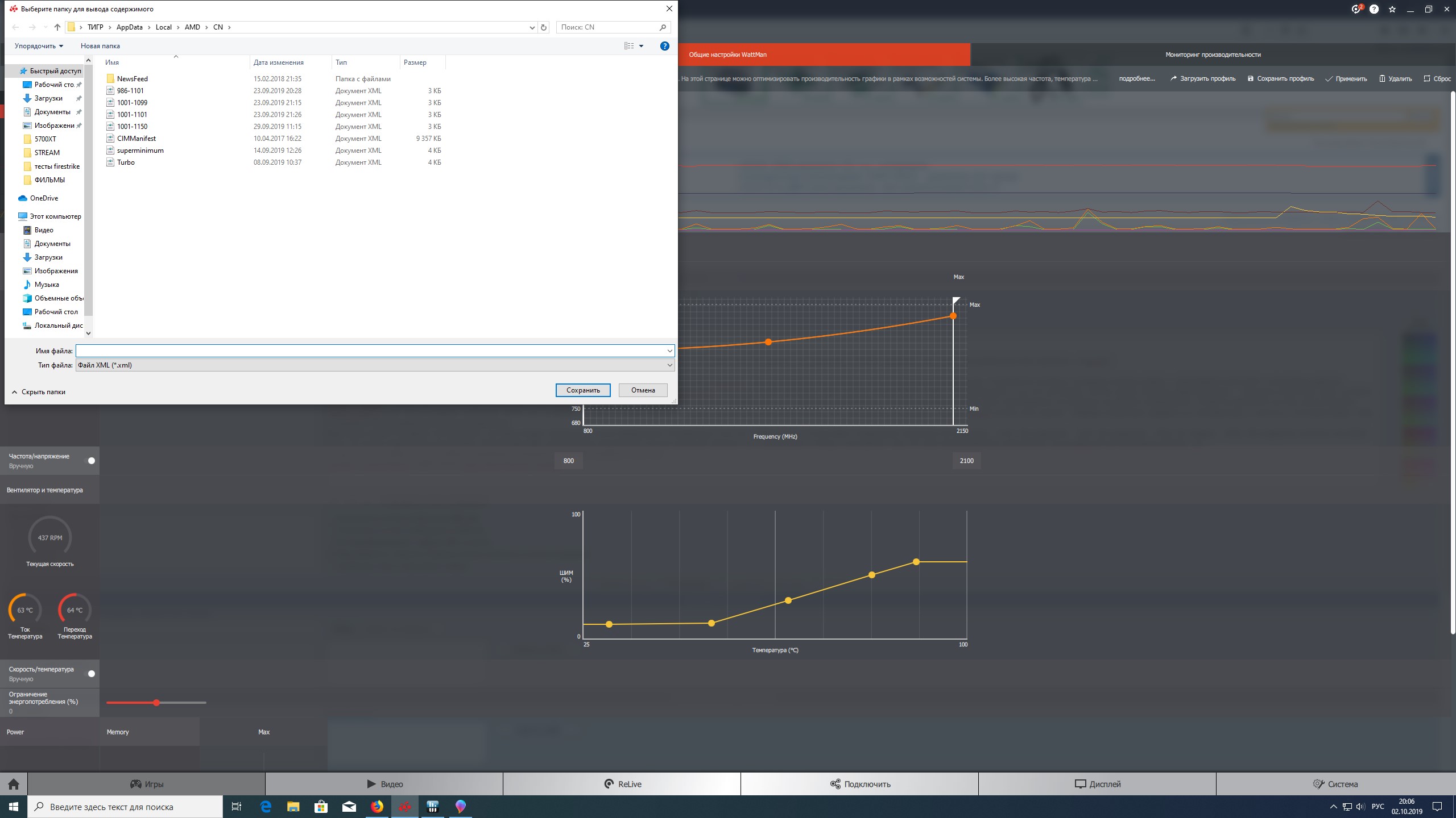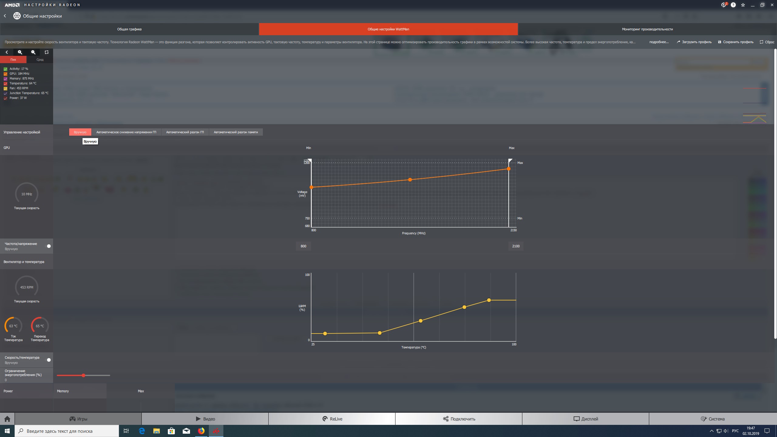 У меня стоят как раз 19.9.2. Настраивается все очень просто. Заходишь во вкладку игры\общие настройки\общие настройки ваттман. Там нажимаешь на кнопочку частота\напряжение вручную. Становится активно соседнее окошко рядом с оранжевой полоской и начинаешь двигать оранжевые точки. Я ставил нижний порог в 950 - карта вылетала с бсодом или игрухи крашились. Опытным путем поставил 1001 (когда ставил 999 и 1000, тоже вылетали, я хз что за магия). Потом начал снижать верхний порог - сначала снизил до 1100, но были бсоды и краши. Поднял до 1150 и стало нормально. Есть еще оранжевая точка посередине, но я ее оставил как есть (можешь попробовать подтянуть вверх). Чипы могут реагировать по разному на разное напряжение. Чтобы не вылетать из игр, воспользуйся файрстрайком для теста каждого значения. Если что-то будет не так, он сразу покажет - будут артефакты или даже начать тест нормально не сможет. Насчет hwinfo писал пост ранее - выведи отдельные графики на температуру и частоту и последи будет тебя устраивать быстродействие\шум\температура. Вертушки можно оставить на автомате, но карта будет греться до почти предельных температур и это не очень хорошо. Я поставил следующие значения 30 градусов - 11%, 50 градусов - 12%, 65 градусов - 30%, 81 градус - 50%, 90 градусов сначала поставил 55%, но потом поднял все же до 60%. Играю один фиг в вакуумных наушниках и в них шума не слышно, но у меня еще и стенд, а не корпус, так что шум приличный без наушников, но до веги 64 ей все равно далеко Память лучше не гони вообще. Ее нормально гонят те, у кого водоблок - на наших с тобой картах там даже нет прямого контакта теплотрубок с памятью, кроме первых трех чипов, если смотреть с конца карты.