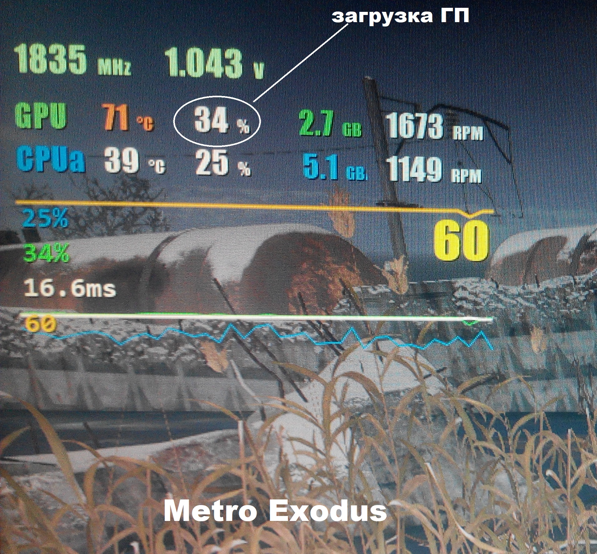 Подскажите плиз (я всё про даунвольтинг 1070), что отображает значение загрузка ГП и как это коррелируется с его частотой. Так в одном случае (ГТА 5) загрузка ГП - 75% при частоте около 1000. В другом (Метро), загрузка 34% при частоте 1835 МГЦ. Получаться: в ГТА большая загрузка - меньше температура; а в Метро - наоборот. Почему игры так по разному себя ведут?