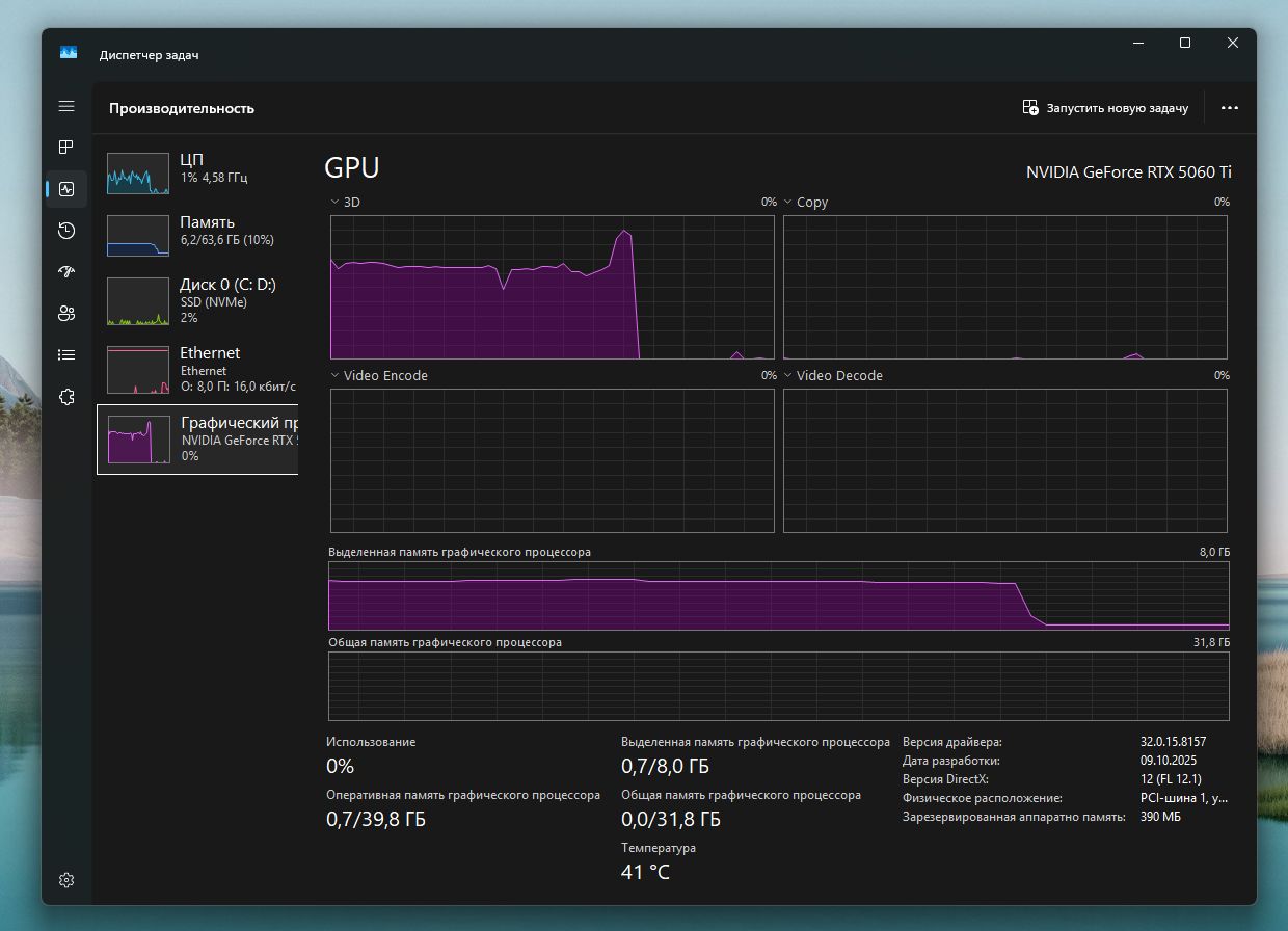 Уважаемые форумчане! Может кто-то сталкивался с проблемой несовместимости новой RTX5060ti и м.п.? Ситуация следующая. Новая карточка устанавливается в комп с мп на Н410 чипсете. Процессор i5 10 серии. Блок питания отличный, на 600Вт. При запуске любого 3D приложения, карта работает на полной мощности 5-7 секунд и начинает тормозить. В Furmark это проявляется по падению значения GPU Power с 99 до 10-15%. Соответственно и сцена тоже начинает жутко тормозить. И все это дело сопровождают периодический черный экран и ребут. Ни переустановка драйверов с предварительным удалением с DDU, ни обновление системы поверх, ни копание в параметрах драйверов и bios, не дали результата. На моей же более старой системе на Н61 и i7-4770- все отлично.