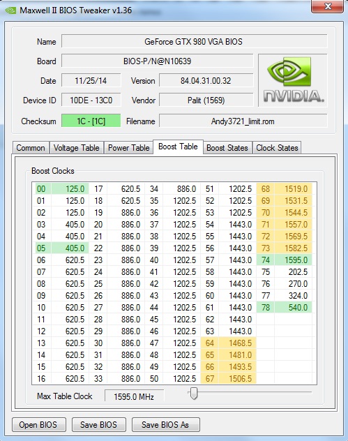 Информация от участника темы: Аффторитет Приведу пример как разгонять карты 970/980/980ti по таблице буст частот. Не буду писать как бекапить/сохранять биос, как и какие ставить поверлимиты - все это есть в шапке темы в инструкции по разгону. Образцом к материалу будет моя MSI GTX970 gamming 100ME. Поиграл я с разгоном в Afterburner-e и решил зашить разгон в биос. Задача разогнать карту бустом до 1506МГц при напруге в 1.231в. Начинаем.