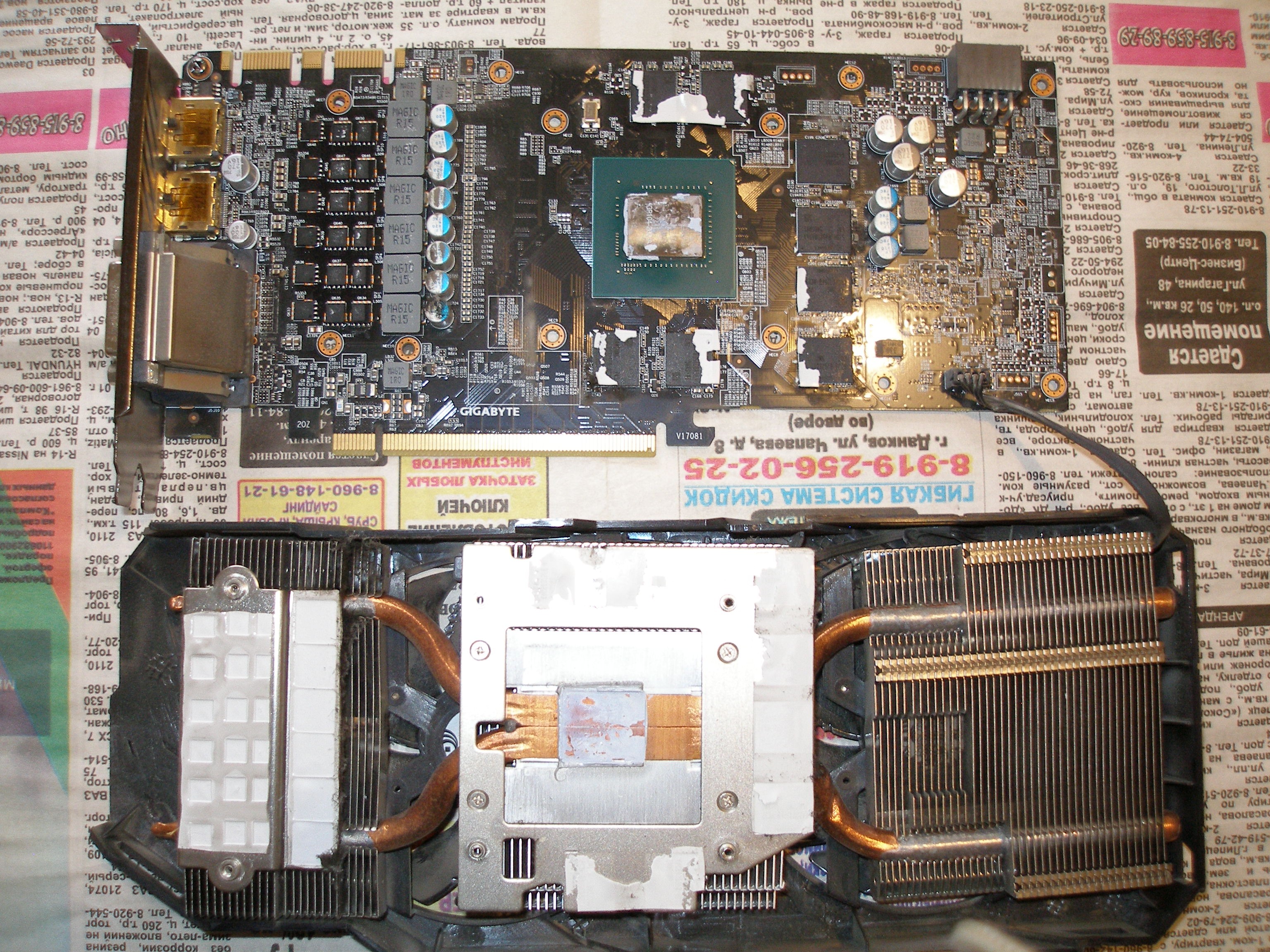 Поделюсь опытом. На новый 2019й год взял после года майнинга за 15к свою 1070 виндфорс. Две недели назад (т.е. год майнила, полтора года работала с даунвольтингом у меня) разобрал почистить, паста была суховатая, но не совсем сухая. Прокладки на вид не потёкшие, может если немного - либо майнила недолго, либо в хороших условиях. На вид не разбирали, я первый, хотя пломб не было. Почистил, сменил пасту на МХ4, температуры особо не изменились - СО слабая. По итогу сейчас при +30 градусов в комнате в играх 68-72 с даунвольтингом до 1.0 В. (PL 100%), вот сатисфактори в стиме гоняю, там 72 градуса при 80-120 фпс. Если АБ ограничить до 90 фпс, то 65-67 градусов, т.к. загрузка вк падает. Т.к. карта второй ревизии относительно редкая, вот фотка внутрянки ДО чистки.