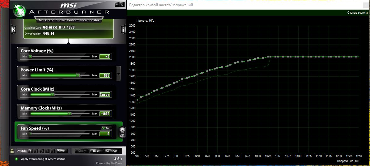 Даунвольтинг лучше делать по максимуму и уже от минимального напряжения начинать разгонять ядро, по дефолту там накидывают 1.050v это вообще не дело, особенно для рефов. К примеру, так как сейчас жарко я тупо через Ctrl + F выбрал минимальный вольтаж 0.700mv и зафиксировал его через Ctrl + L, выставил обороты вентиля на минимум 60%, применил и сохранил профиль. То есть выше 0.700mv вольтаж не поднимается вообще. В зависимости от игры, на этом профиле я разгоняю карту, вот например при 0.700 +200мгц по ядру (когда как в стоке это 1166). #77 Зимой же я ставлю 0.800mv и юзаю карту в стоке, при 1800мгц.