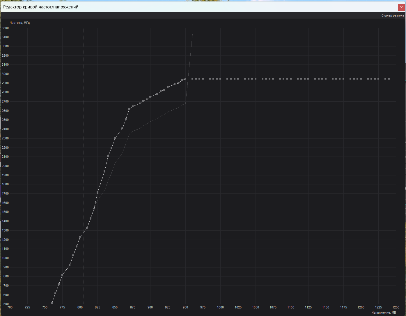 0. Необходимо задрать левую часть кривой повыше - выбираем любую крайнюю правую точку, зажимаем Ctrl и тянем вниз, тем самым поднимая левую часть кривой. Без разницы, за какую точку тянуть, но здесь лучше задрать самую левую часть повыше (но, карта всё равно будет сбрасывать её до некоего потолка, который на кривой превысить просто не получится). 90% обычных пользователей обойдутся без опционального пункта 0 и будут двигать всю кривую только альтом. Но, тех, кто захочет выжать из карты побольше потенциала, ждёт ловушка из-за небольшой дельты запаса потенциала в правой части, по сравнению с левой.