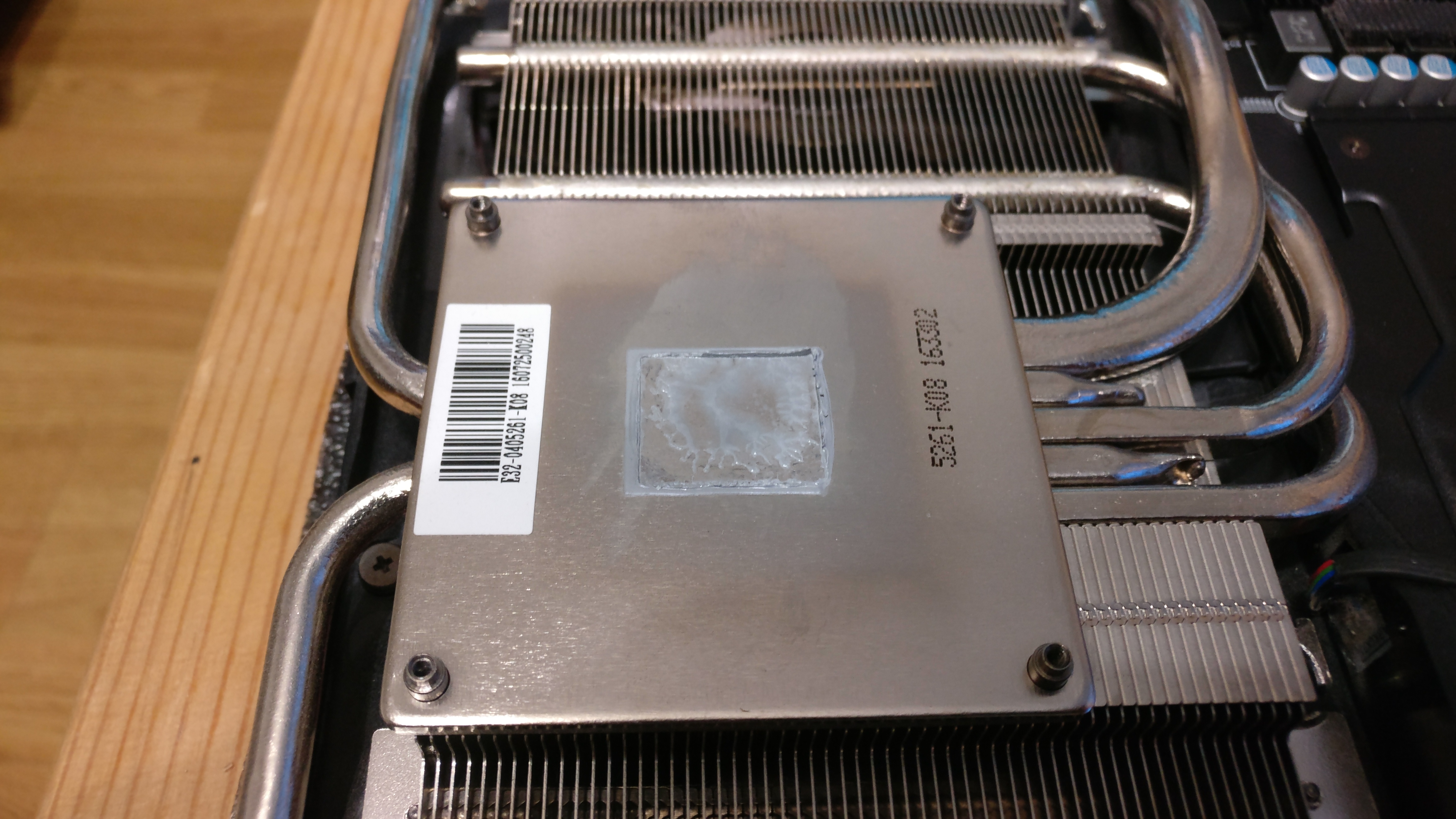 Возник вопрос по запотеванию. Не оно ли? Посмотрел туда поглубже, термопрокладки на месте, толщина не изменилась, всё визуально ок, кроме этого маслянистого следа: