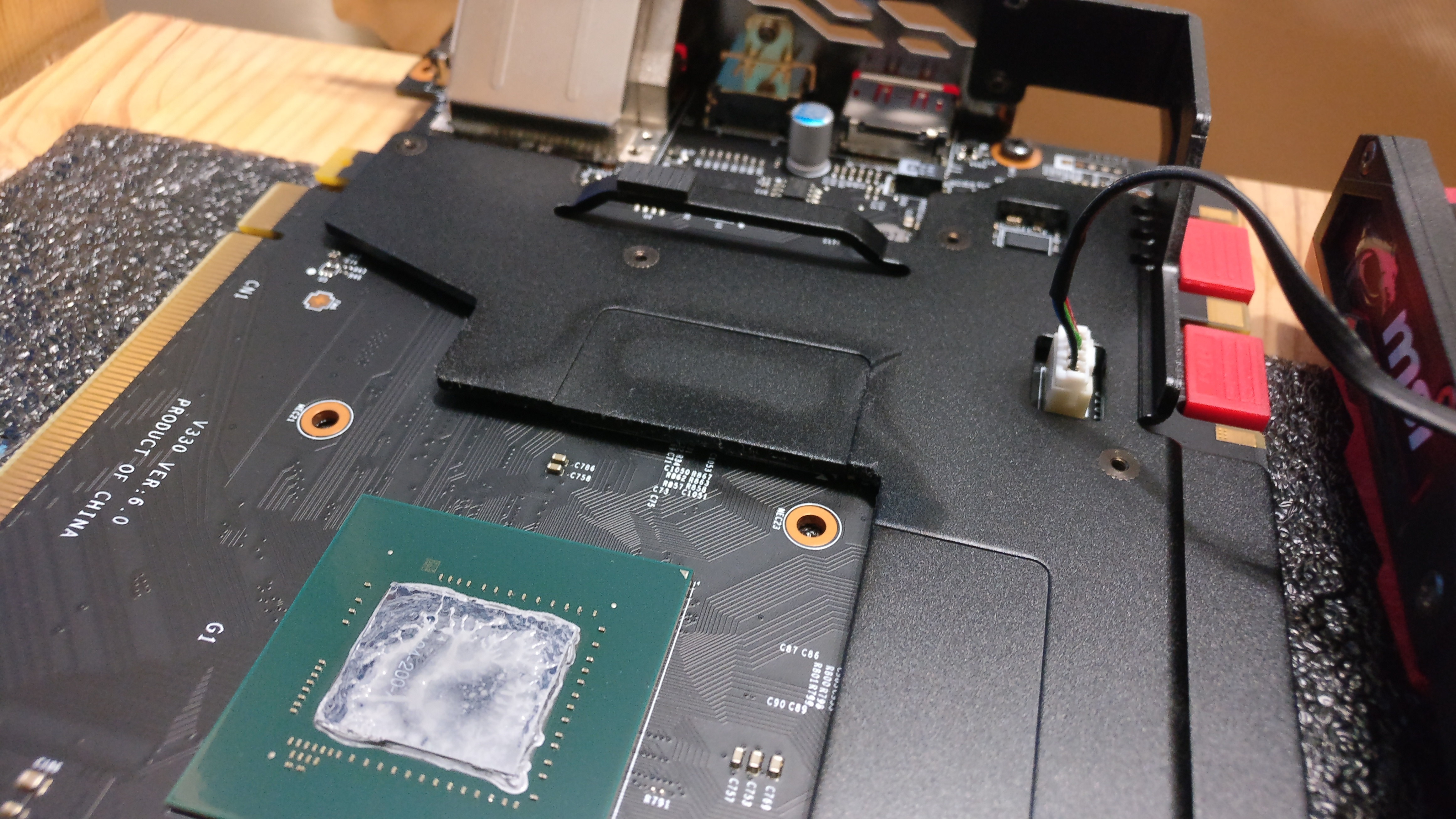 Настало и в моём регионе настоящее лето, поэтому температура видяхи заинтересовала. Включил Afterburner и офигел - выше 80 градусов даже с открытой боковой стенкой и даже на 90% оборотах вертушек. Разобрал. Термопаста растеклась по краям чипа, но при этом не засохла, сам чип оказался без неё, вокруг чипа следы флюса...