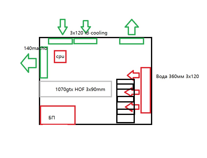 Alexshanghai Вопрос в другом - куда девать избыточное давление этого воздуха? В твоём случае ещё и от процессора горячий воздух кто вытянет? Задний? Тогда у него должно быть не менее 1500 об/мин.