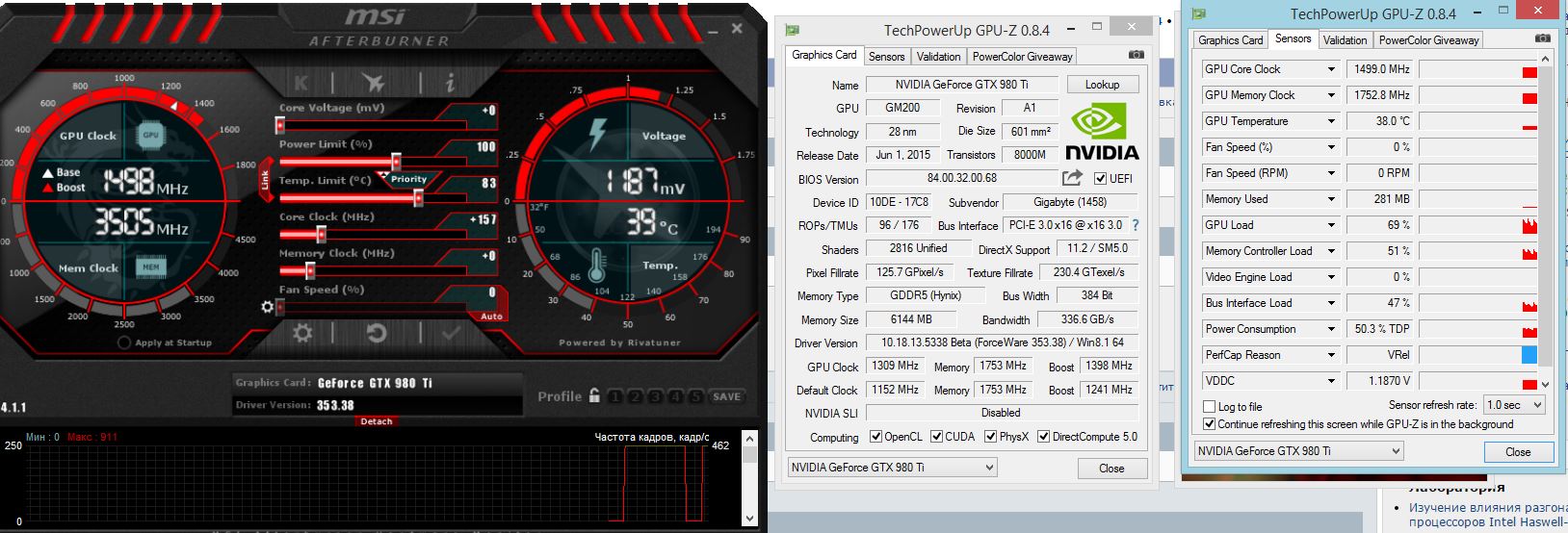 Информация от участника темы: olegdjus Решил и я свою лепту внести в разгон Maxwell (750ti/950/960/970/980/980ti/TitanX) с рассмотрением ключевых параметров. Так как я не сторонник отключения Boost - то будем с ним. Но начнем с подготовки. а) Шьем крайний стоковый BIOS для Вашей карты. б) Качаем msi afterburner и gpu-z и устанавливаем их. в) Тут три варианта. 1)Если не желаем поднять напряжение - пропускаем пункт в. 2) Если желаем поднять на шаг или два (на разных карта даже одного производителя шаг напруги может быть разный, так что всё индивидуально) - прибавляем в ab по 10мВ к напряжению (остальные вкладки не трогаем) и во вкладке датчиков gpu-z(Sensors) смотрим нагрузку под встроенным рендером(нажать вопрос в первой вкладке gpu-z рядом с Bus Interface и нажать Start Render. Нас интересуют в датчиках показания GPU core clock и VDDC. Выбираем подходящий вариант и идем дальше. 3) Если желаем понизить напряжение - объясню во вкладке напряжений, чтобы не повторяться. Далее скачиваем архив с программами для редактирования и прошивки BIOS. Открываем с помощью MaxwellBiosTweaker свой BIOS и начинаем редактировать.