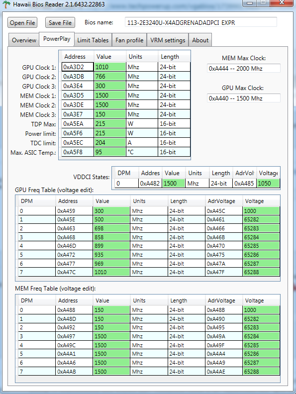 Добавлено спустя 2 минуты 12 секунд: Сохрани свой биос помоему через gpu z делается затем открой гаваи биос идитор и сравни частоты