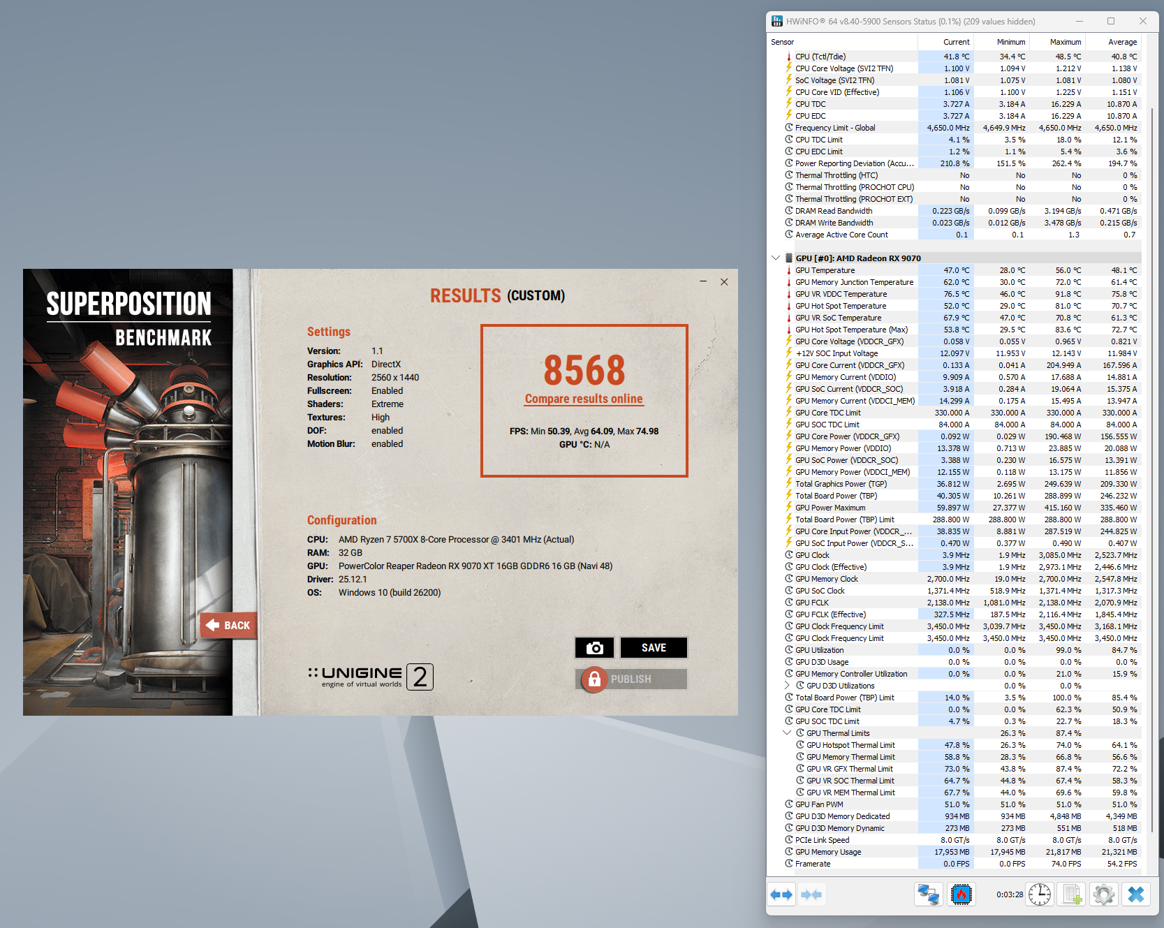 я так и не понял что мы сравниваем ты же хотел сравнить 9070 обычную а у тебя тоже ХТ версия вот мой результат, 82 хотспот, примерно 2000 оборотов вентиляторы, 288 Вт. В адреналине у меня -15 пл, -50 напряжение, +100 память #77