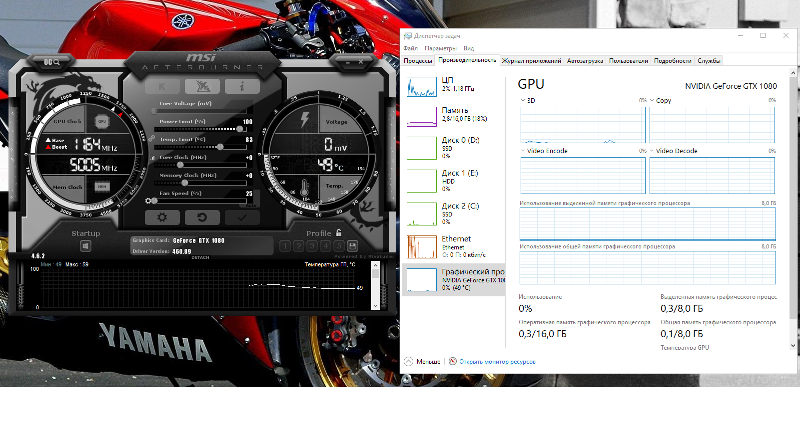 Нажал на i внизу ничего нету, пробовал ставить GTX 1060, тоже грузит почти на максималку частоты. В диспетчере все норм. Вариант есть - форматнуть диски, но не охота