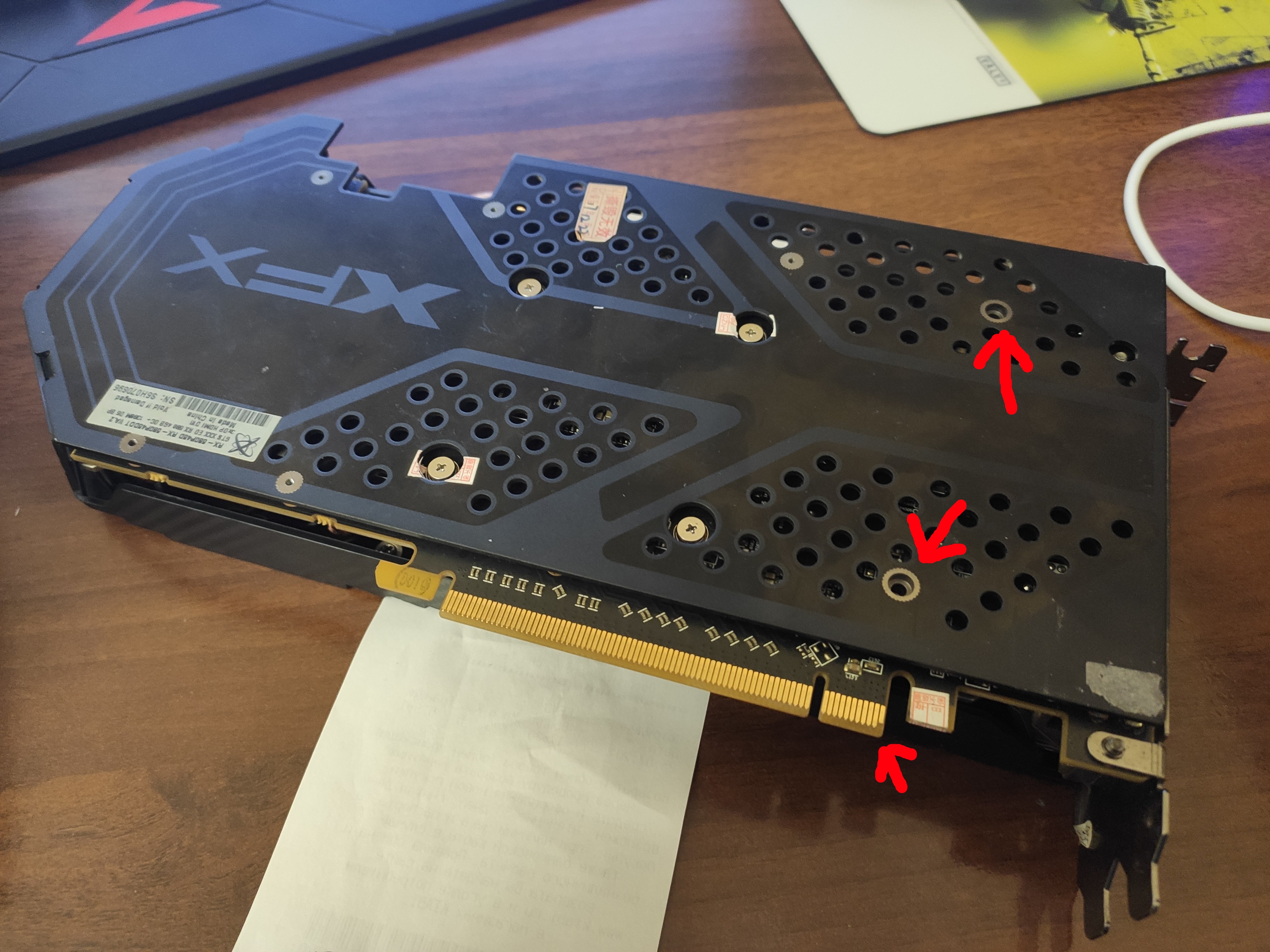 Нужна помощь. Китайцы продали карту XFX RX580 без двух винтов. Винты отсутствуют на бэк плейте, и они стягивают между собой радиатор и бэкплейт. Может кто, пожалуйста, замерить данные винты и выложить их наименование. Фото прилагаю.