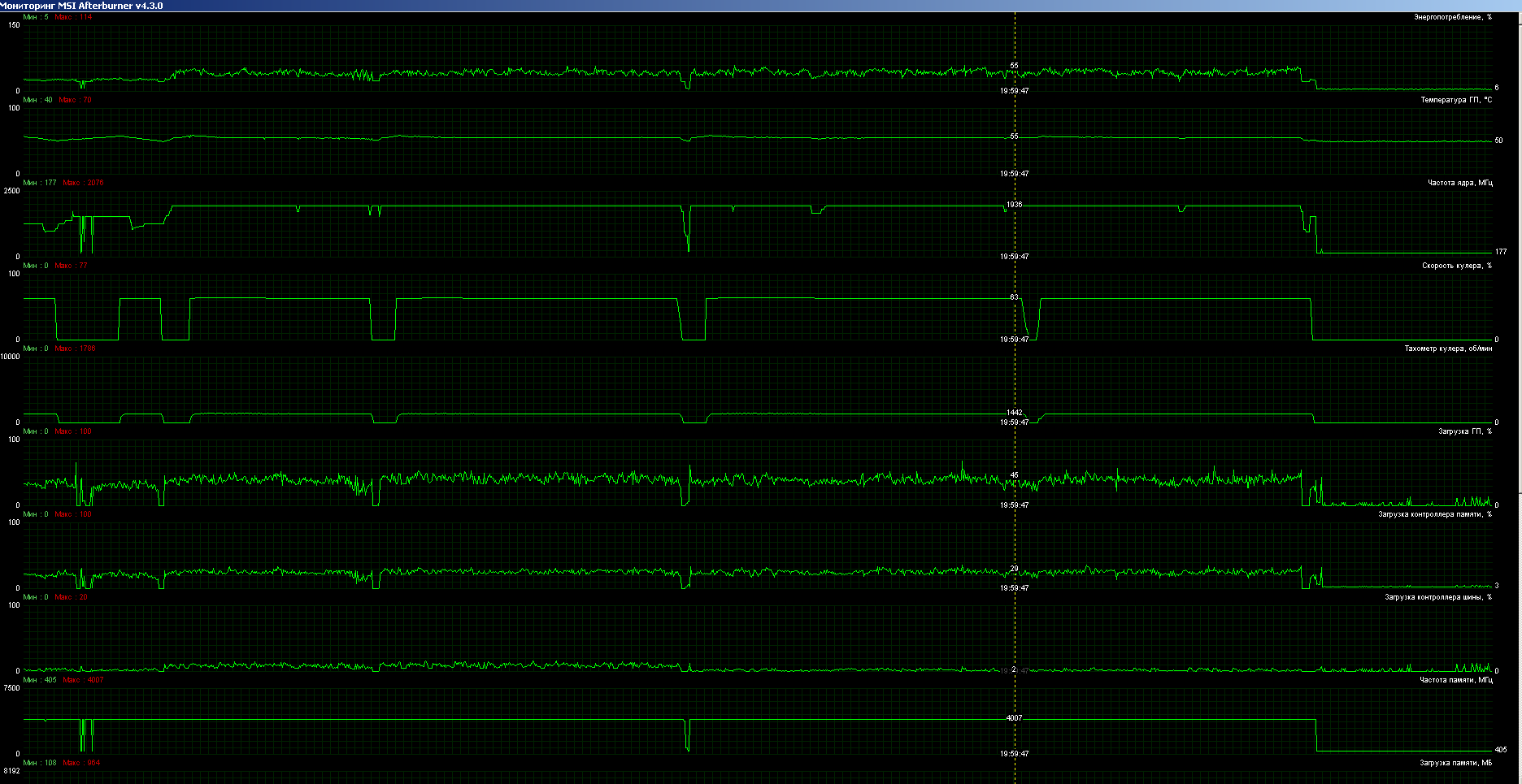 Я бы настроил старт вентиляторов при более низкой температуре через MSI AB, что и всем сделать советую. Потому что 50-55C на чипе со стоящими вентилями может быть и в GTA 5, за счет отличного охлада чипа, а вот память и vrm не мониторятся, но температуры там будут уже как минимум 70С. По этой же причине особо душить вертушки не стоит, оптимально - около 1000 rpm, чтобы продувало радиатор до платы. Иначе мы имеем вроде бы холодную видюху, но с довольно горячими vrm и памятью.