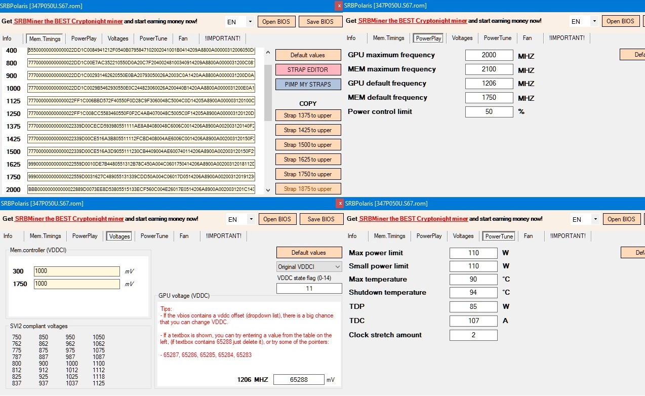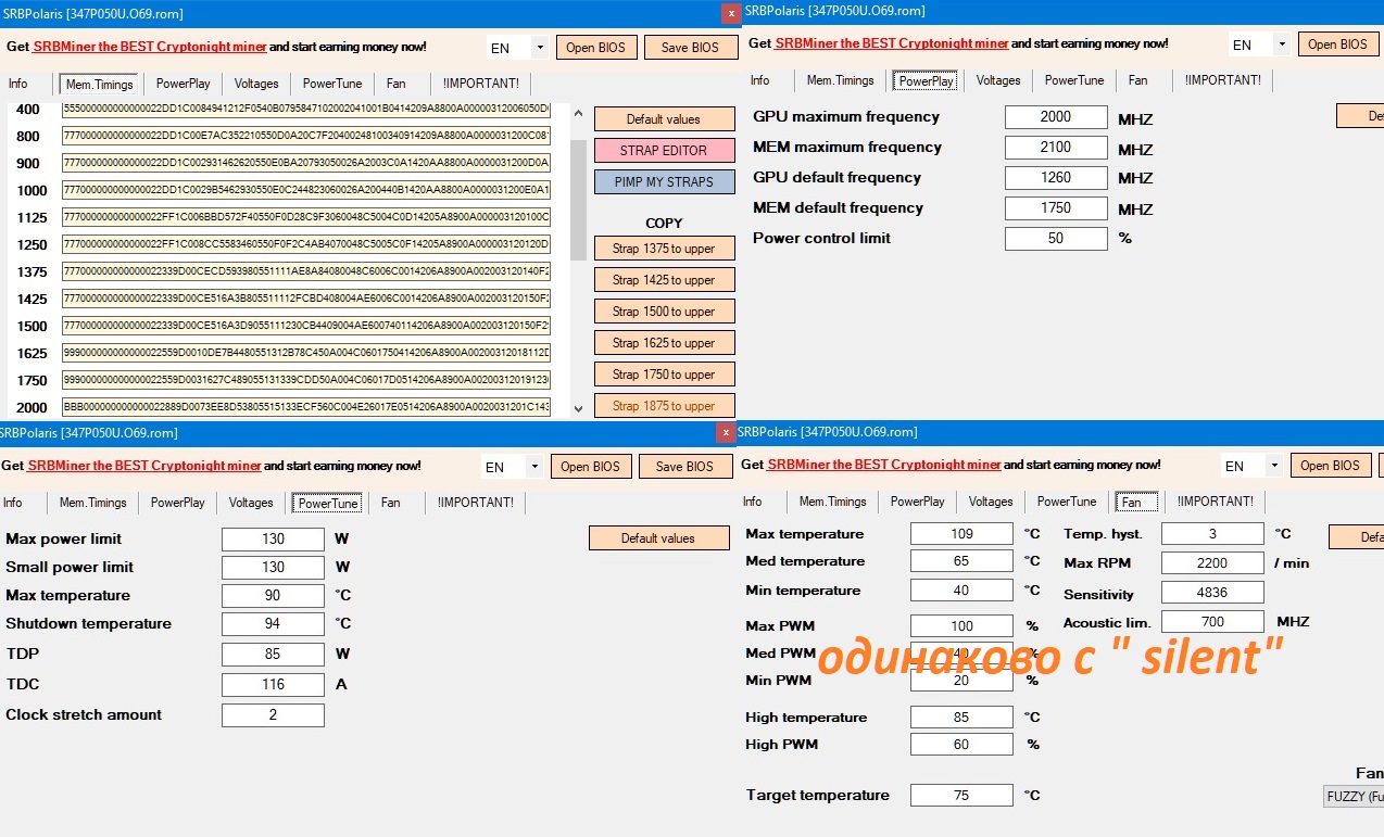 слей BIOS через GPU-Z, например, или через atiflash_293, открой в SRBPolaris. (прямая ссылка на SRBPolaris ). На RX470 Nitro+ два BIOS, левое положение "silent", правое ОС (по умолчанию). Так выглядит оригинальный BIOS "silent" RX474 Sapphire Nitro+ на чипах SK Hynix