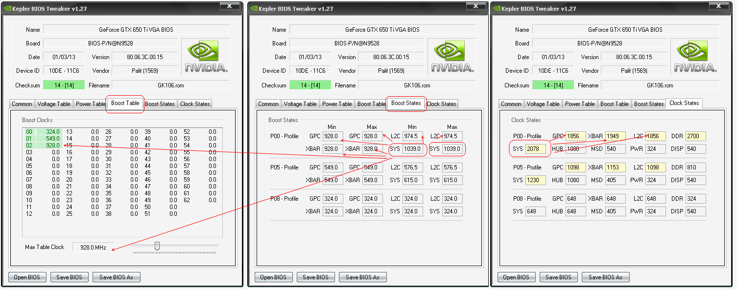 1) Открываем BIOS с помощью KBT, заходим в Boost Table. 2) Смотрим на значение частоты в ячейке 01(или ячейки, которую желаем изменить) #77 3) Преобразуем номер ячейки: а) Для GTX 670/680/760/770 (GK104. Kepler 28nm) к значению ячейки(в моём случае 01) прибавляем 13 и полученное значение(14) переводим в НЕХ (14d=Eh) б) Для GTX TITAN /GTX 780/GTX 780Ti/GTX TITAN BLACK (GK110. Kepler 28nm) прибавляем 14 и полученное значение переводим в НЕХ (для ячеек с 00 по 05 значения ячеек для GK104 и GK110 одинаковы) 4) Значение частоты ячейки умножаем на 2 (536.0*2=1072 и 549.0*2=1098) и переводим в НЕХ(1072d=430h и 1098d=44Ah). 5) Открываем BIOS с помощью HEX-редактора 6) Ищем с помощью поиска следующее значение в шестнадцетиричной форме - xx aa bb, где: xx - полученный номер ячейки в HEX-коде aa - младшие разряды частоты в HEX-коде bb - старшие разряды частоты в HEX-коде Пример с пояснением: а) Для GTX 670/680/760/770 (GK104. Kepler 28nm) xx - 0E aa - 30 bb - 04