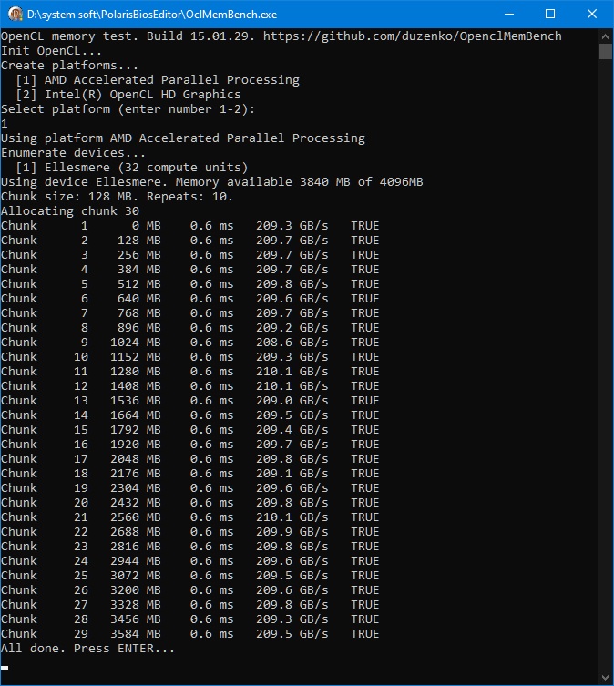 Chunk 1 0 MB 0.6 ms 220.0 GB/s TRUE Chunk 2 128 MB 0.6 ms 220.1 GB/s TRUE Chunk 3 256 MB 0.6 ms 220.2 GB/s TRUE Chunk 4 384 MB 0.6 ms 220.4 GB/s TRUE Chunk 5 512 MB 0.6 ms 219.9 GB/s TRUE Chunk 6 640 MB 0.6 ms 213.1 GB/s TRUE Chunk 7 768 MB 0.6 ms 214.3 GB/s TRUE Chunk 8 896 MB 0.6 ms 219.9 GB/s TRUE Chunk 9 1024 MB 0.6 ms 219.8 GB/s TRUE Chunk 10 1152 MB 0.6 ms 220.5 GB/s TRUE Chunk 11 1280 MB 0.6 ms 219.8 GB/s TRUE Chunk 12 1408 MB 0.6 ms 219.8 GB/s TRUE Chunk 13 1536 MB 0.6 ms 219.5 GB/s TRUE Chunk 14 1664 MB 0.6 ms 219.7 GB/s TRUE Chunk 15 1792 MB 0.6 ms 219.9 GB/s TRUE Chunk 16 1920 MB 0.6 ms 219.8 GB/s TRUE Chunk 17 2048 MB 0.6 ms 219.7 GB/s TRUE Chunk 18 2176 MB 0.6 ms 219.9 GB/s TRUE Chunk 19 2304 MB 0.6 ms 219.5 GB/s TRUE Chunk 20 2432 MB 0.6 ms 219.5 GB/s TRUE Chunk 21 2560 MB 0.6 ms 219.5 GB/s TRUE Chunk 22 2688 MB 0.6 ms 220.0 GB/s TRUE Chunk 23 2816 MB 0.6 ms 219.8 GB/s TRUE Chunk 24 2944 MB 0.6 ms 220.0 GB/s TRUE Chunk 25 3072 MB 0.6 ms 219.8 GB/s TRUE Chunk 26 3200 MB 0.6 ms 219.5 GB/s TRUE Chunk 27 3328 MB 0.6 ms 220.0 GB/s TRUE Chunk 28 3456 MB 0.6 ms 219.6 GB/s TRUE Chunk 29 3584 MB 0.6 ms 219.8 GB/s TRUE Chunk 30 3712 MB 0.6 ms 220.0 GB/s TRUE Chunk 31 3840 MB 0.6 ms 219.7 GB/s TRUE Chunk 32 3968 MB 0.6 ms 219.7 GB/s TRUE Chunk 33 4096 MB 0.6 ms 219.6 GB/s TRUE Chunk 34 4224 MB 0.6 ms 219.3 GB/s TRUE Chunk 35 4352 MB 0.6 ms 220.0 GB/s TRUE Chunk 36 4480 MB 0.6 ms 219.5 GB/s TRUE Chunk 37 4608 MB 0.6 ms 219.4 GB/s TRUE Chunk 38 4736 MB 0.6 ms 220.4 GB/s TRUE Chunk 39 4864 MB 0.6 ms 220.3 GB/s TRUE Chunk 40 4992 MB 0.6 ms 220.4 GB/s TRUE Chunk 41 5120 MB 0.6 ms 220.1 GB/s TRUE Chunk 42 5248 MB 0.6 ms 220.1 GB/s TRUE Chunk 43 5376 MB 0.6 ms 219.8 GB/s TRUE Chunk 44 5504 MB 0.6 ms 220.3 GB/s TRUE Chunk 45 5632 MB 0.6 ms 215.0 GB/s TRUE Chunk 46 5760 MB 0.6 ms 214.7 GB/s TRUE Chunk 47 5888 MB 0.6 ms 211.2 GB/s TRUE Chunk 48 6016 MB 0.6 ms 214.3 GB/s TRUE Chunk 49 6144 MB 0.6 ms 215.1 GB/s TRUE Chunk 50 6272 MB 0.6 ms 209.8 GB/s TRUE Chunk 51 6400 MB 0.6 ms 214.3 GB/s TRUE Chunk 52 6528 MB 0.6 ms 220.5 GB/s TRUE Chunk 53 6656 MB 0.6 ms 205.5 GB/s TRUE Chunk 54 6784 MB 0.6 ms 214.1 GB/s TRUE Chunk 55 6912 MB 0.6 ms 218.5 GB/s TRUE Chunk 56 7040 MB 0.6 ms 209.0 GB/s TRUE Chunk 57 7168 MB 0.6 ms 217.6 GB/s TRUE Chunk 58 7296 MB 0.6 ms 215.9 GB/s TRUE Chunk 59 7424 MB 39.2 ms 3.3 GB/s TRUE Chunk 60 7552 MB 41.7 ms 3.1 GB/s TRUE Chunk 61 7680 MB 41.7 ms 3.1 GB/s TRUE Chunk 62 7808 MB 41.9 ms 3.1 GB/s TRUE Chunk 63 7936 MB 41.4 ms 3.1 GB/s TRUE Chunk 64 8064 MB 40.1 ms 3.2 GB/s TRUE All done. Press ENTER...