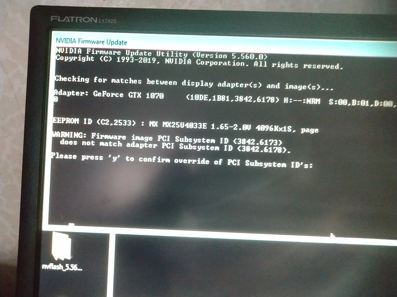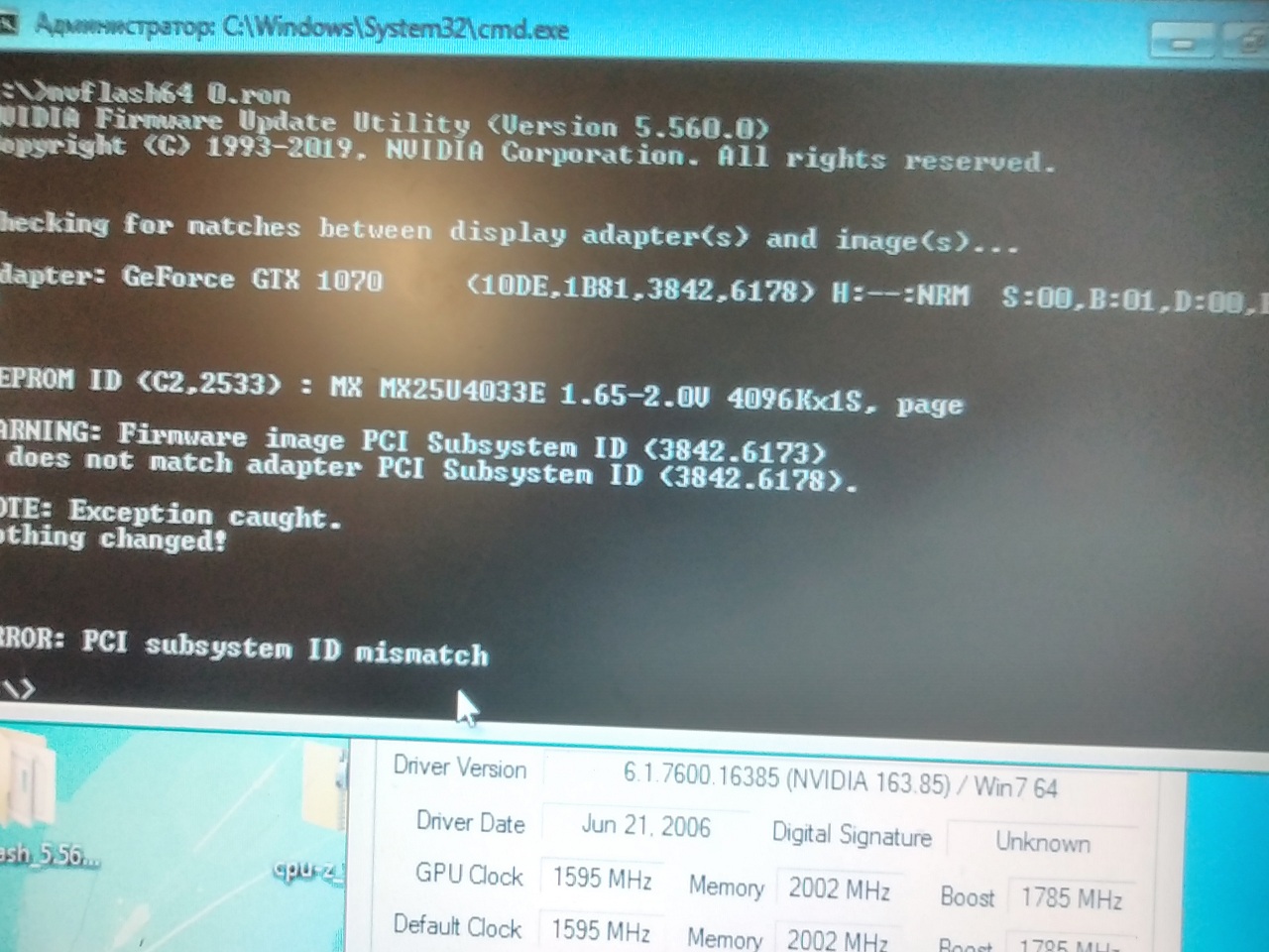 Добрый день В продолжении моей истории... Nvflash 5.56 заработал, но возникла проблема с тем что жалуется на версию прошивки... пытался прошить EVGA.gtx1070.8192.161015.rom конечно можно было бы наверно снять ограничения на несовместимость... Но кирпич получить не хочется Кто знает подскажите... на что жалуется... Спасибо.