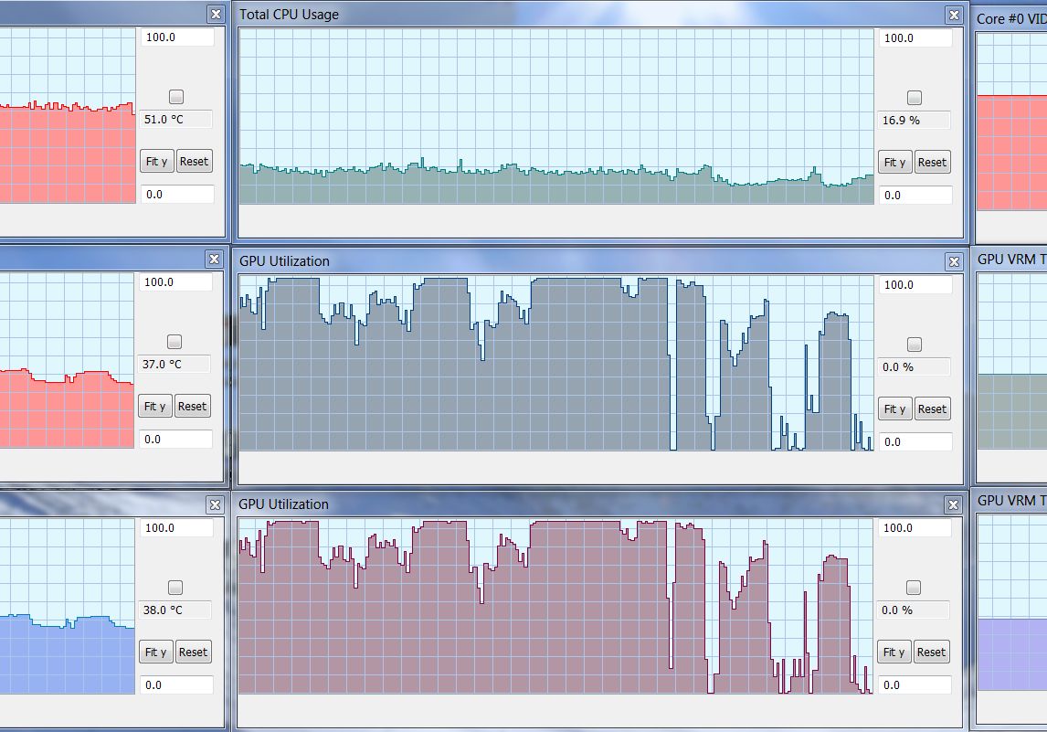 Metro LL проходил в 1440p, BF3/Crysis3 играю в 1080p, так как 2x7970 местами притормаживают (не много таких моментов, но они есть). Но, ни разу не замечал 100% загрузки камня (профиль). Вот, сейчас мочил "главного" в Crysis3, вот такие графики: CPU максимум (сейчас 4.3Ghz) 27%, в среднем где-то 19%. Видео, как видно, очень часто на 100% при 1080p: все в максимум (MSAA 8x), за исключением AA - 8x (вместо максимальных 16х).