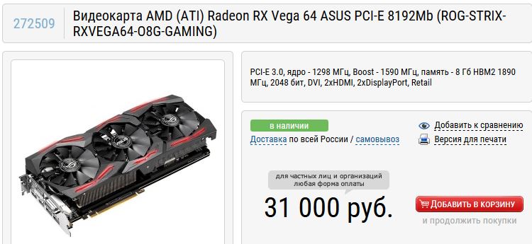 Nocturnal Мое мнение, что это дорого. В прошлую среду, один известный магазин в Москве торговал полдня Вегами 56 (референсы) по 21 000 рублей., правда без игр, с гарантией 1 год. Как увидел в 12:00 дня, сразу оформил через сайт заказ, поехал после 15:00 свободно забрал. Память HBM2 Самсунг. На сегодняшний момент наконец-то майнеры откололись уже, и цены устаканились на Веги 56. За свои деньги сейчас, полагаю на рынке ничего нет лучше. Может конечно, что и в НВидиях можно было бы урвать при мониторинге цен, но они меня в принципе не интересуют ("мыльные" технологии и преждевременное откывливание своей продукции прошлых поколений видеокарт для меня неприемлемо). 31 тысяча как-то не очень за этот Асус. В воскресенье ещё одна компания торговала по 22 000 рублей Веги 56 (референсы) тоже без игр, и гарантия 1 год, так что в принципе можно ещё, кому надо будет Веги 56, дождаться распродаж компаниями. В начале февраля перед стартом продаж в мире Радеон VII, в Москве было предложение на референсы Вега 56 по 24 500 рублей с 3 играми по акции АМД.