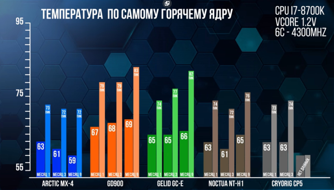 У МХ-4 нет падения температуры со временем, как в его тестах, она держится на одном и том же уровне. Ноктуа - дает результат лучше чем МХ-4 на несколько градусов, тоже стабильно держит температуру. Гелид в руках не держал.