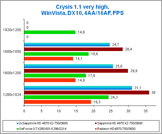 "В игре Crysis мы тестировали в режиме Very High. Всё же в нашем распоряжении оказались мощнейшие видеокарты. Разрешение 1920x1200 в этой игре по-прежнему представляет проблему для видеокарт серии Radeon HD 4000, в нём попросту отсутствует изображение, хотя игра работает, не зависает"
