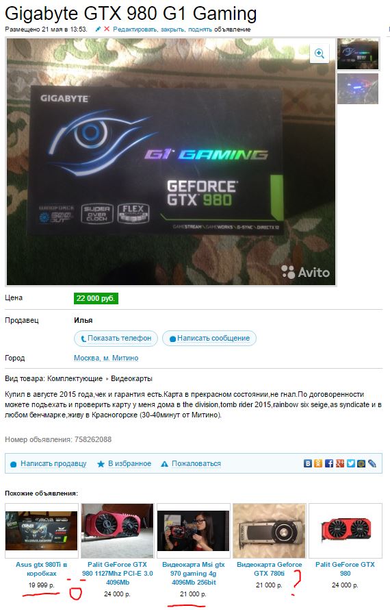 Вот, именно такую 980G1 и брал месяц назад на авито за 29тыр, только в питере, с собой взял ствол, бабло и приехал на адрес, полюбовался на исполинский телек у компа, тут же прогнали утилиты и тесты, вынули из компа, отмаксал деревянные, всунул карту в коробку и помчался домой, чел распродавал 3шт. из своих запасов, всё новенькое и блестящее, даже пылинки не было. А перед этим как раз смотрел тему про злобное кидалово на авито))