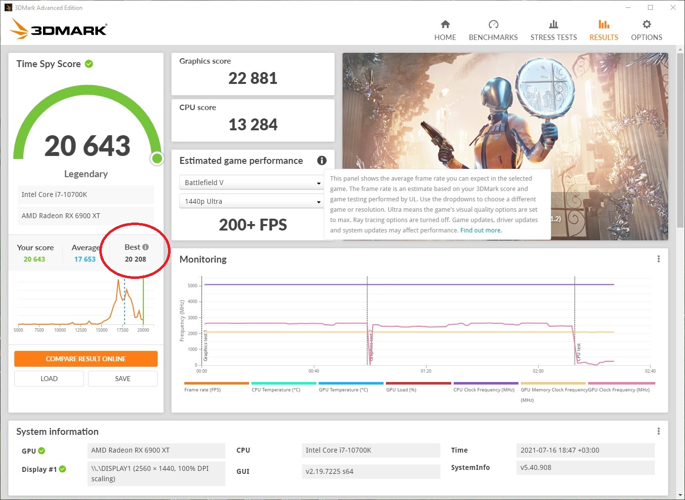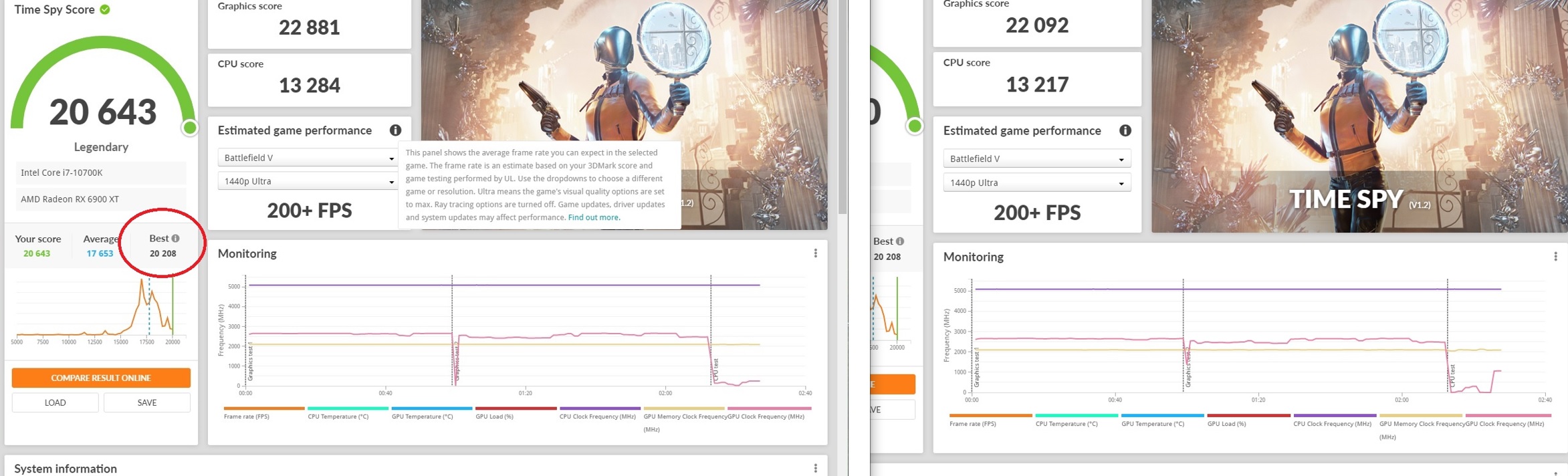 А вот этот вопрос я задал себе в ноябре )) В итоге у меня 6800хт На самом деле при равных частотах разница должна быть порядка 10%, но почему-то обычно получается 5-7... 22620, разница по сути 1%, но у меня это предел на грани стабильности, а у вас нет ))