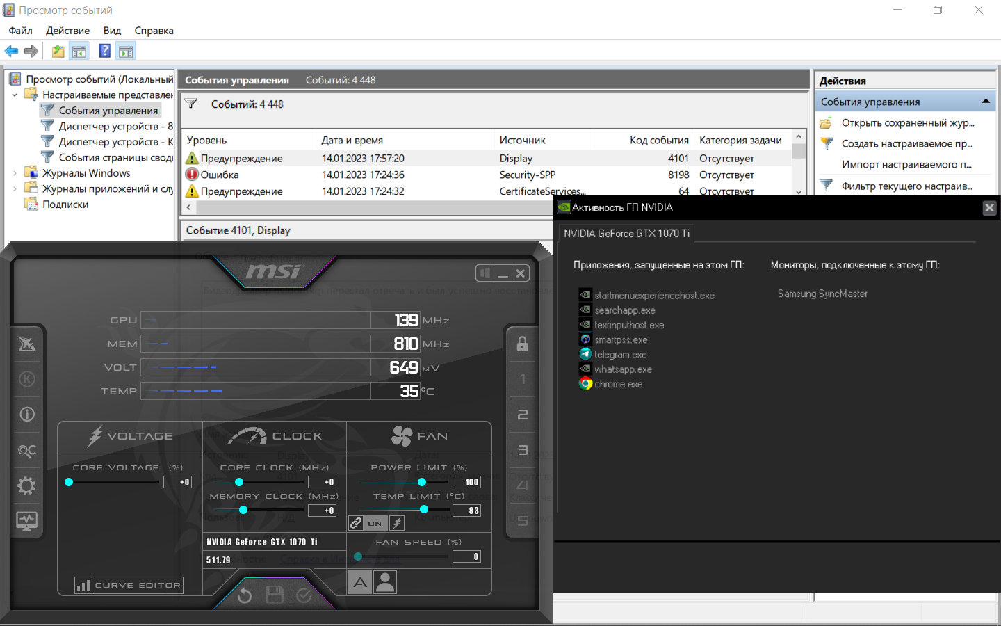 периодически, не систематично, отваливается драйвер прямо в винде. Рандомно, без нагрузки, с простойными температурами, во время конференций в Zoom и просто браузинга через Хром (youtube и прочее). Темнеет экран на 5-8 секунд, теряет сигнал, а потом обратно выкидывает в винду, как будто ничего не произошло. И можно использовать ПК дальше, но при этом в Событиях появляется запись про то, что nvlddmkm перестал отвечать.