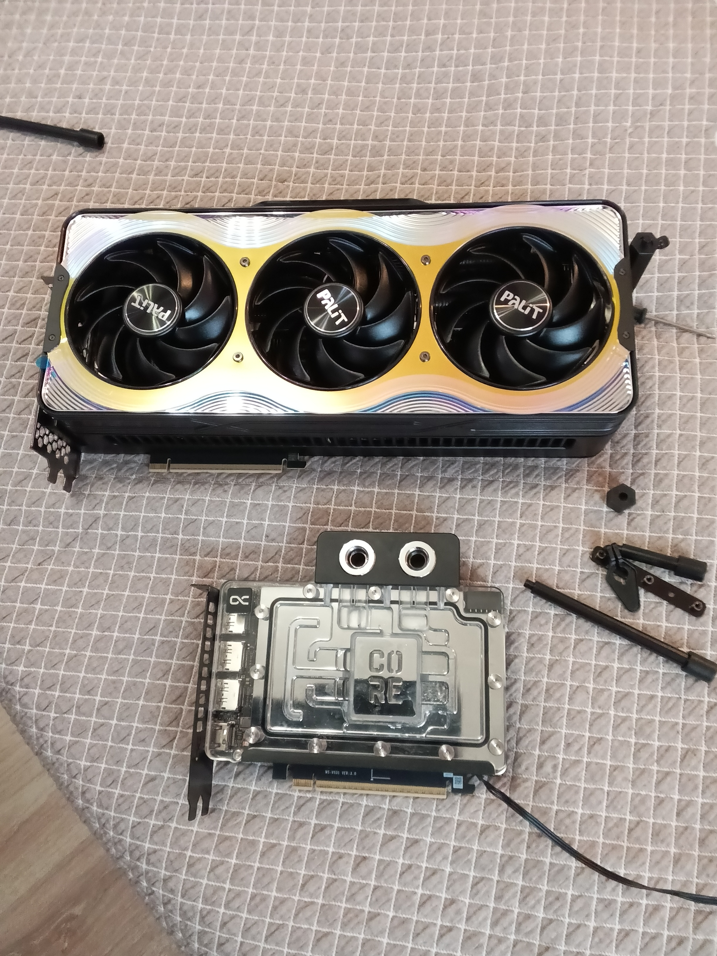 Получил я свой Barrow для Palit RTX 5090 GameRock, брал тут за 8 тр https://aliexpress.ru/item/100500944735 ... 1742713296, 2 дня убитых просто, начну с того что инструкции нет, то что у них на сайте по прокладкам полная хренотень http://www.barrowint.com/product/qfgxkl ... /1857.html по самому блоку, он шикарен, я промерил все размеры штангеном, сделан за такие деньги ну просто отлично, только продал свою 5080, на нее ставил Алфакул за оферпрайс, что то около 25 тр, вот решил попробовать барров, то что у них написано на сайте по прокладкам, куда какие нужны полная туфта, чуть мосфеты себе не спалил, ну уроды, такой качественный блок делаете, неужели как в Алфакуле трудно сделать инструкцию и положить правильные прокладки, вот 2 дня сидел правильно подбирал прокладки, кому нужно сделать рисунок, так же установил свою пружину рамку под проц, а вот винти взял от барроу, потому что розными не дожималось, так же установил 3 мм прокладки с другой стороны под память и разъем 12pvr, по аналогии от Алфакула, в итоге при 800 ватт с прошитым биосом от матрикса в бублике 61-64, память 45, на воздухе улетал за 90 на полных оборотах на 800 ватт, все время была открыта крышка, да и шум стоял. Сделал всего одну фотку, было не до фоток, руки трусились, и раз не доткнул, карта не завелась, кирпичей в штаны наложил, карта под 300 к и тока купил блин