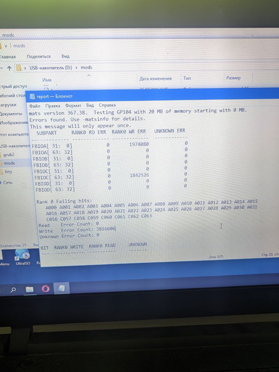 Добрый вечер, случилась такая ситуация, нужно поменять банки памяти на GTX 1070 Gigabyte Rock. тест в матс сделал, прошу подсказать по тесту какие конкретно банки сломаны (прошу это выделить на моей фотографии).