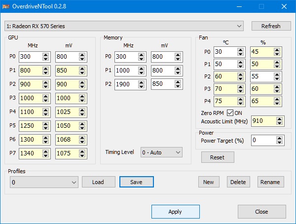 Мне ввиду неудачности чипа долго мудрить не пришлось, в стоке было 1230 МГц при 1.081В, доработал до 1250 МГц при 1.05В, а память в итоге погнал с 6600 до 7400 без вмешательства в тайминги (это позже).