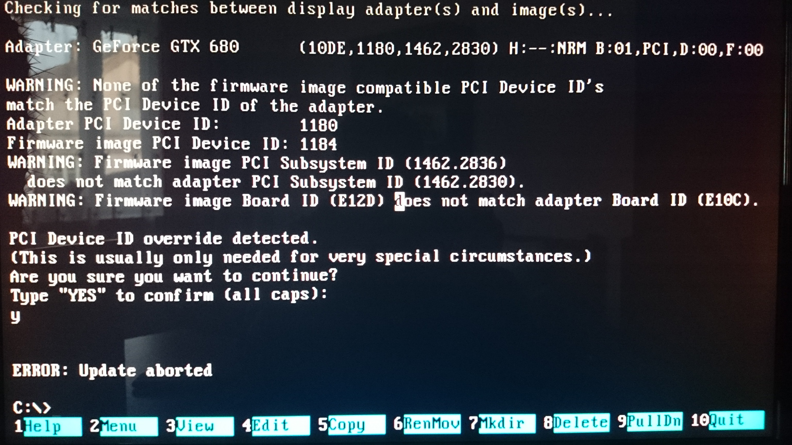 Здравствуйте. Помогите прошить msi ngtx680 lightning биосом от msi ngtx770 lightning. Биос беру отсюда http://www.techpowerup.com/vgabios/inde ... =&memSize= . Беру самый первый (самый поздний). Создаю загрузочную флешку (по инструкции из шапки). Копирую на нее nvflash_5.127 и файл биоса, который переименовываю на gtx770.rom. В dos пишу nvflash gtx770.rom -4 -5 -6. Появляется предупреждение, ввожу "y", enter и появляется вот это
