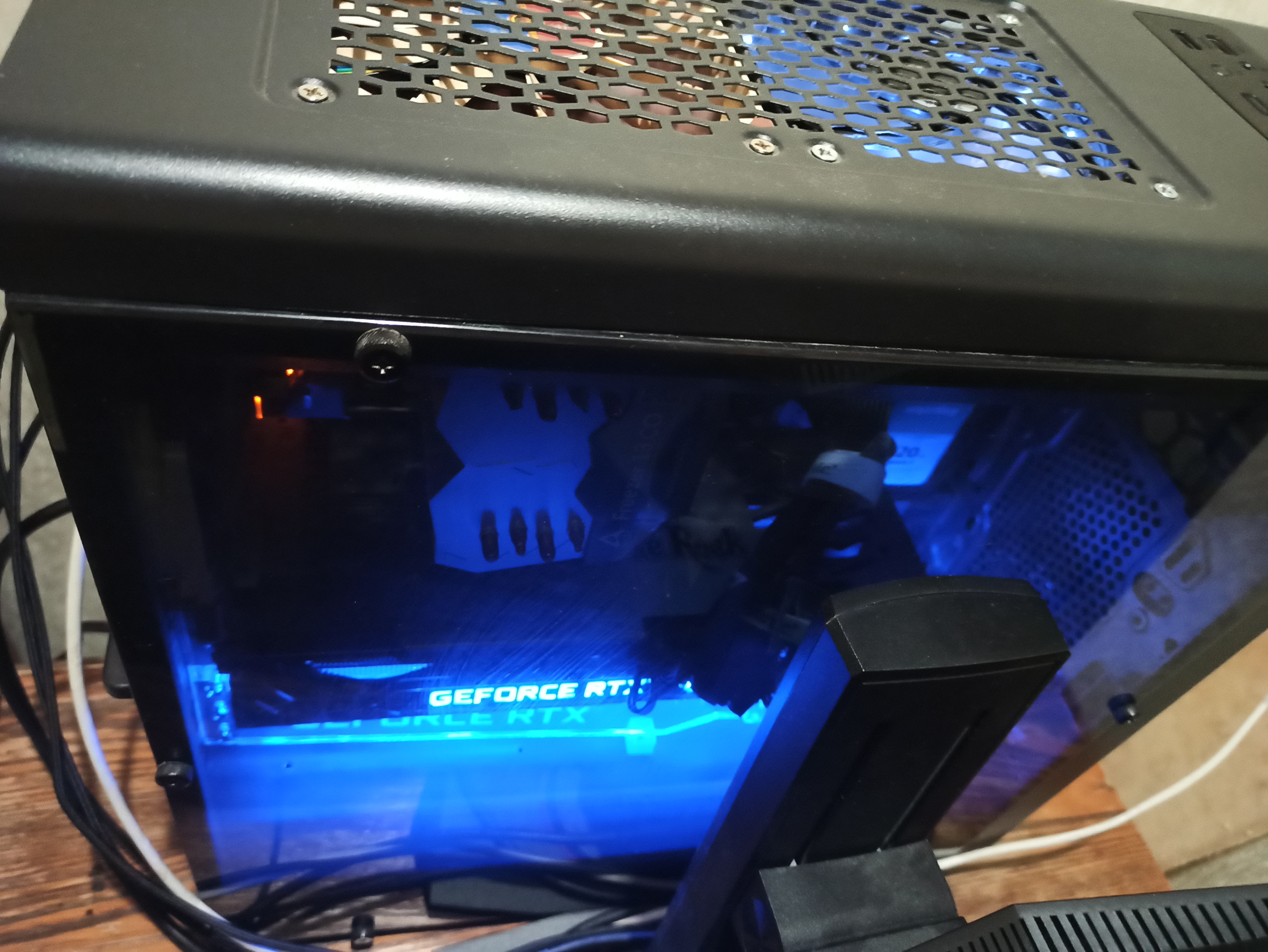 У меня в таком корпусе(сорян за провода,порвал один)),едут новые)достаточно тихо работает,за стеклом вообще комфортно),а вот в нагрузке уже слышно,но не напрягает...приятный такой ,равномерный шум.Ну как бе 1080ти джетстрим была тише в нагрузке))))