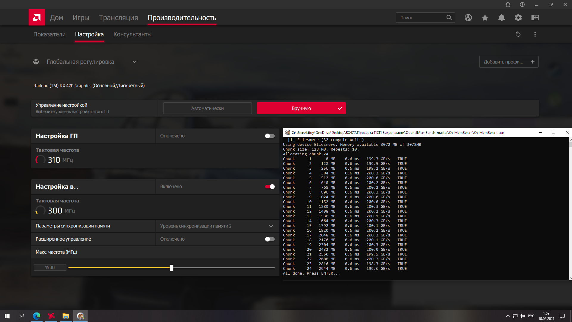 У меня так-то чипы Hynix, и за разгон памяти не я тут тесты провожу В данный момент при настройке "Уровень 2" в драйверах и 1850 МГц частоте выдает около 180 GB/s