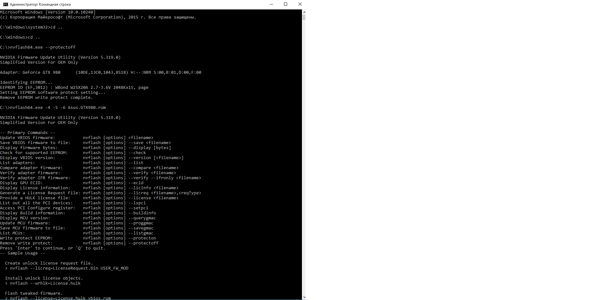 Ребят! Подскажите пожалуйста, не могу прошить карточку Asus GTX 980 Strix через nvflash, отключил защиту, сделал бекап, запускаю прошивку ничего не происходит, просто пишет нажмите Enter или Q