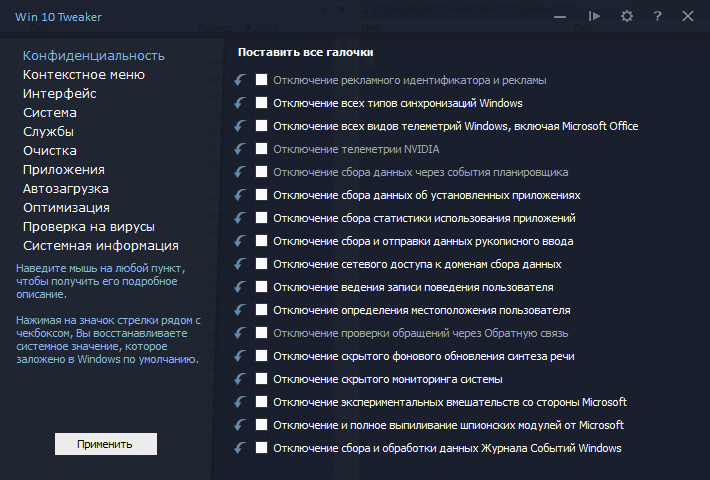 Shark-Nkz я им тоже пользуюсь, а так-же DWS, но больше всего у меня твиков и через командную строку я настраиваю bcdedit /set disabledynamictick yes bcdedit /set useplatformtick yes bcdedit /set tscsyncpolicy enhanced bcdedit /set tpmbootentropy ForceDisable bcdedit /set hypervisorlaunchtype off bcdedit /set quietboot yes bcdedit /timeout 0 bcdedit /set allowedinmemorysettings 0x0 bcdedit /set isolatedcontext No bcdedit /set nx alwaysoff (правда его я отключил) bcdedit /set bootux disabled bcdedit /set bootmenupolicy legacy