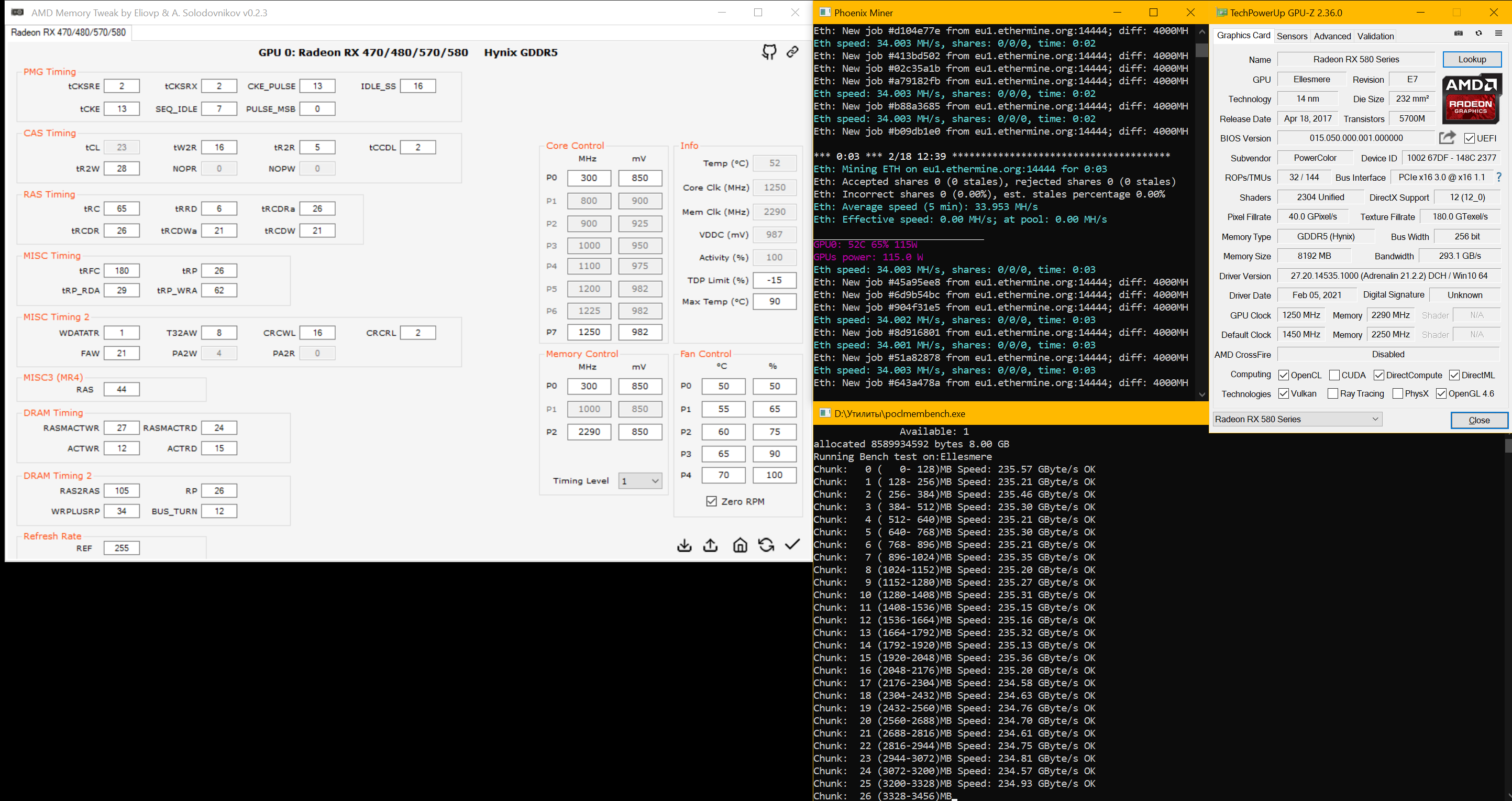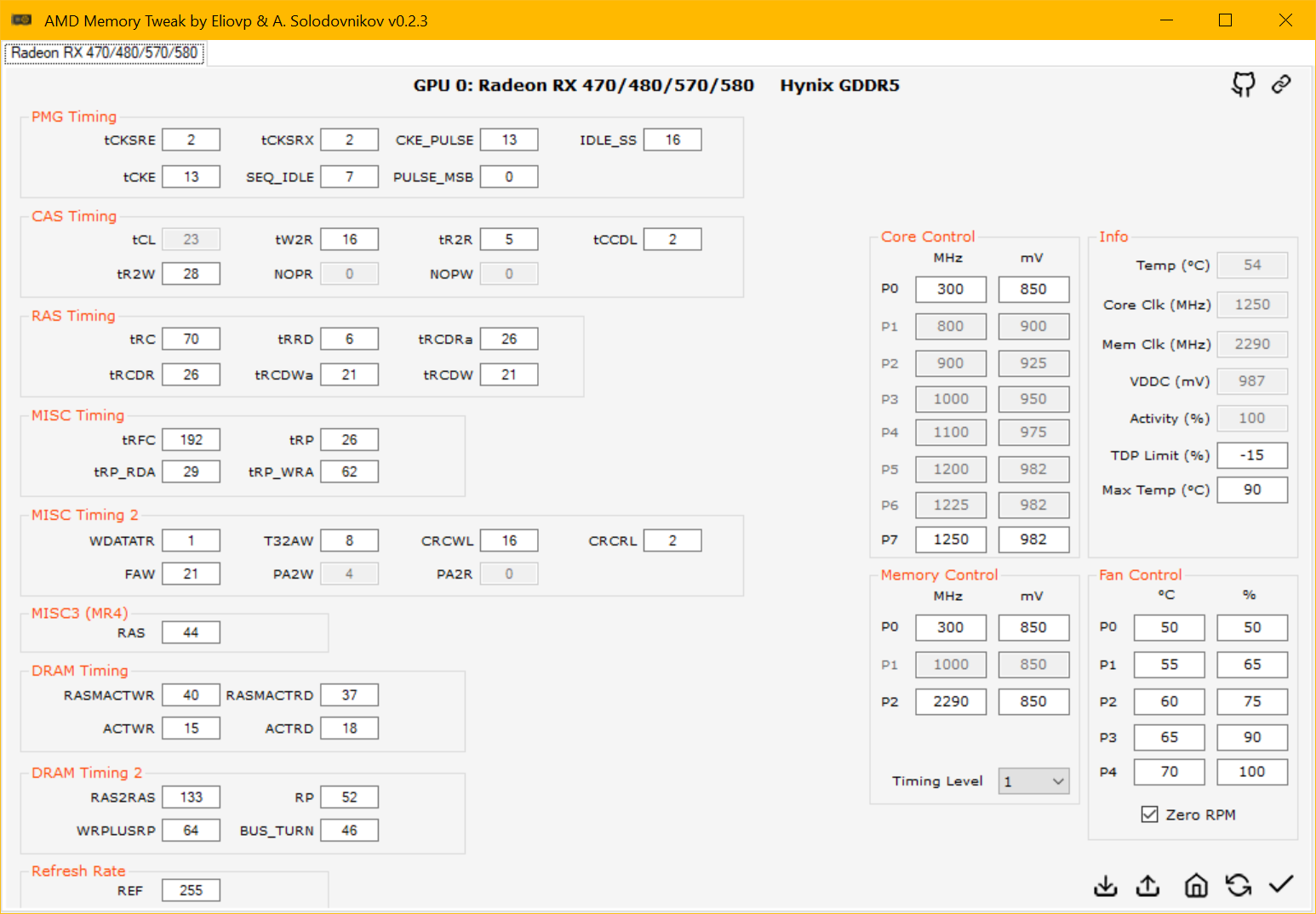 у меня работает AMD Memory Tweak (графический) и WinAMDTweak консольная. я запускаю WinAMDTweak.exe --ref 30 --rc 60 --rfc 97 проверяю с помощью AMD Memory Tweak да тайминги поменялись, но как только нагрузка меняется то тайминги так-же меняются на дефолтные, то есть если я запускаю furmark и --ref 30 --rc 60 --rfc 97 то после как я остановлю furmark и потом опять запущу тайминги будут дефолтные, то есть каждое p-состояние имет свои тайминги и когда переключаются состояния тайминги обнуляются, возникает вопрос а как можно сделать из винды в реальном времени чтоб в нагрузке тайминги в нагрузке были постоянными ?