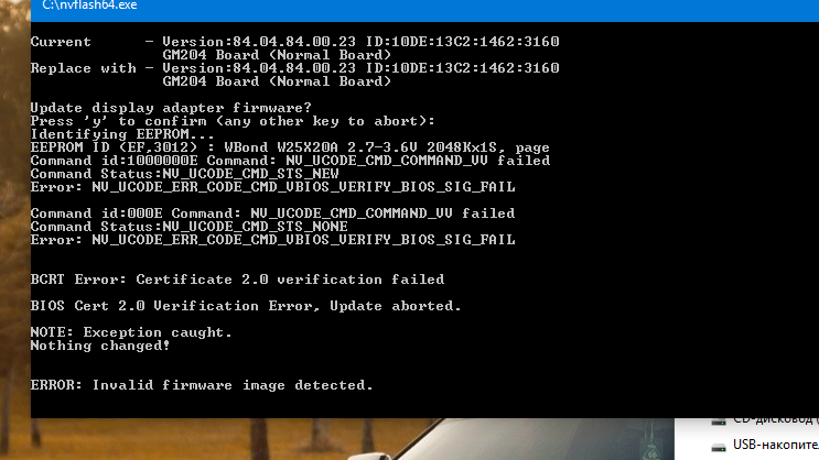 карту отключил в диспетчере скачал ломанный nvflash последней версии при прошивке выдает ошибку (имеет ли значение то что карта подключена к монитору через display port?)