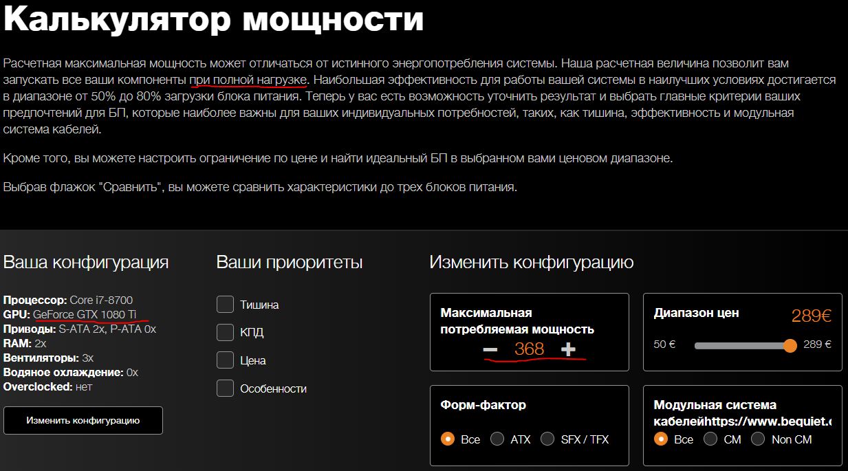 derp на этом форуме есть "тема по выбору блока питания", мне там знающие люди ответили - ни 1080, ни 1080ti много не жрут, для них достаточно нормального 500 вт блока питания, у них там таблица есть, да и в любом калькуляторе фирм торгующими БП нет больших требований по ваттам
