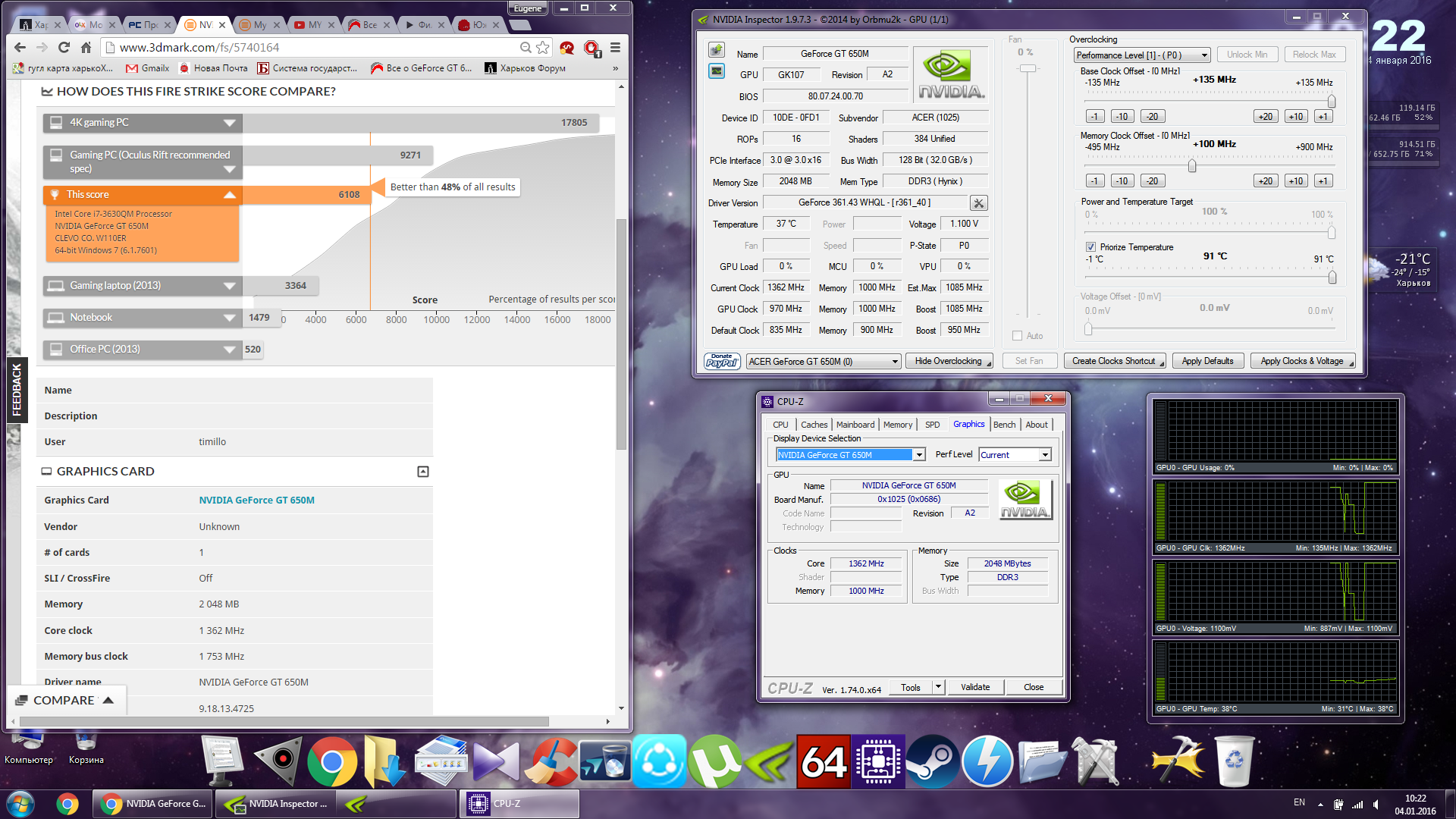714room, это не результат твоей 650m, это результат gtx 960, которая идет в разделе graphics card (secondary), не надо тут людей разводить. Честно говоря, я плохо представляю себе такого франкенштейна, но в топе поиска gt 650m сидят люди с gtx 970 и результатом почти в 10к, в то время, как связка gt 650m SLI с трудом дотягивает до 4к. Вот ссылка на твой рекорд, где можно посмотреть, что не влезло в скрин, или не должно было там светиться http://www.3dmark.com/fs/5740164 , в следующий раз убирай и ссылку со скрина, а то это все легко проверяется.