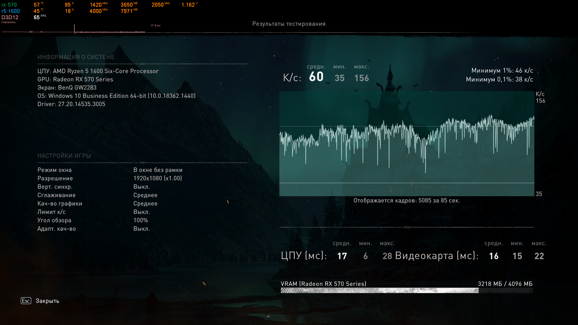 https://forums.overclockers.ru/viewtopic.php?p=17325924#p17325924 дополнение к посту выше. в общем, задумался что разница в бенчмарках есть, а играх нет и причиной может быть тому - не хваток памяти. так как бенчмарки укладываются в 4Гб прогнал pubg с настройками чтобы уложиться в 4gb, настройки одинаковые и вот результаты: RX 570 30-03-2021, 09:39:07 TslGame.exe benchmark completed, 93072 frames rendered in 1122.891 s Average framerate : 82.8 FPS Minimum framerate : 27.9 FPS Maximum framerate : 139.3 FPS 1% low framerate : 32.1 FPS 0.1% low framerate : 27.9 FPS RX 580 30-03-2021, 10:07:57 TslGame.exe benchmark completed, 100476 frames rendered in 1124.078 s Average framerate : 89.3 FPS Minimum framerate : 26.8 FPS Maximum framerate : 145.5 FPS 1% low framerate : 31.5 FPS 0.1% low framerate : 27.1 FPS стоит заметить, что после шаманства 580ка почти не сбрасывала частоту (только одна сцена в дыме), и мы получили почти 10% прироста
