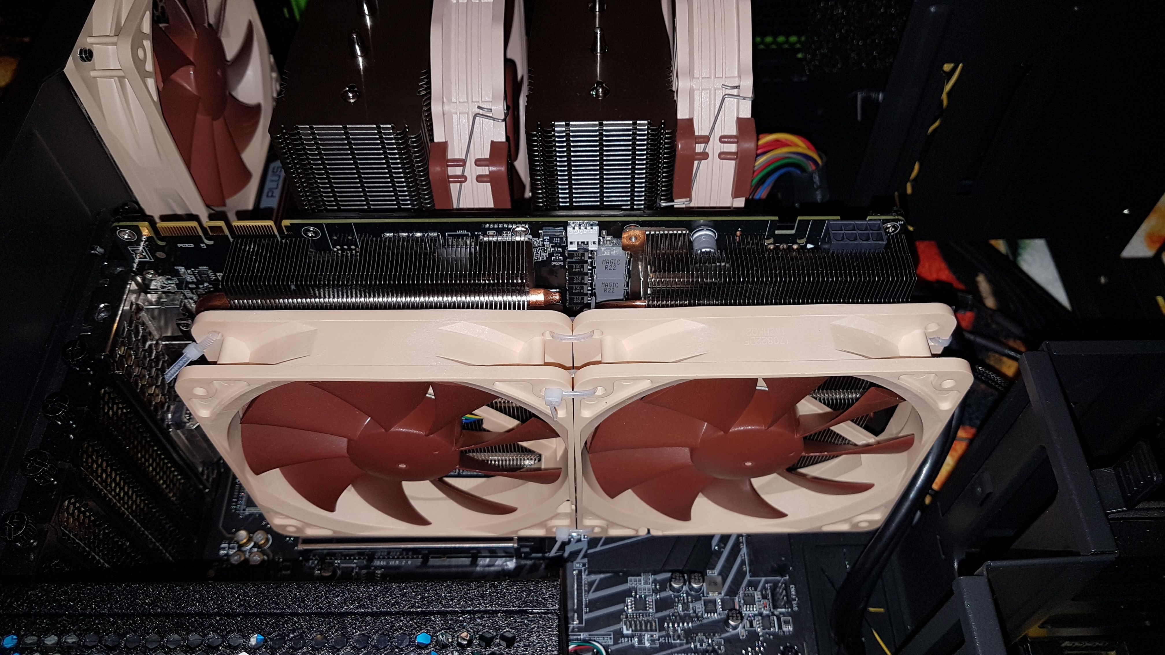 Во, норм такой себе колхоз. А почему именно Noctua выбрали для этого дела? Кстати подключили вертушки к материнке или же на видеокарте использовали разъём?