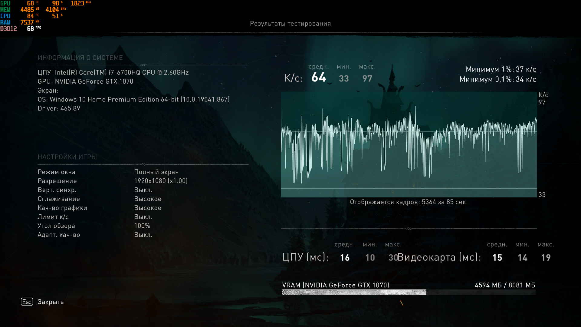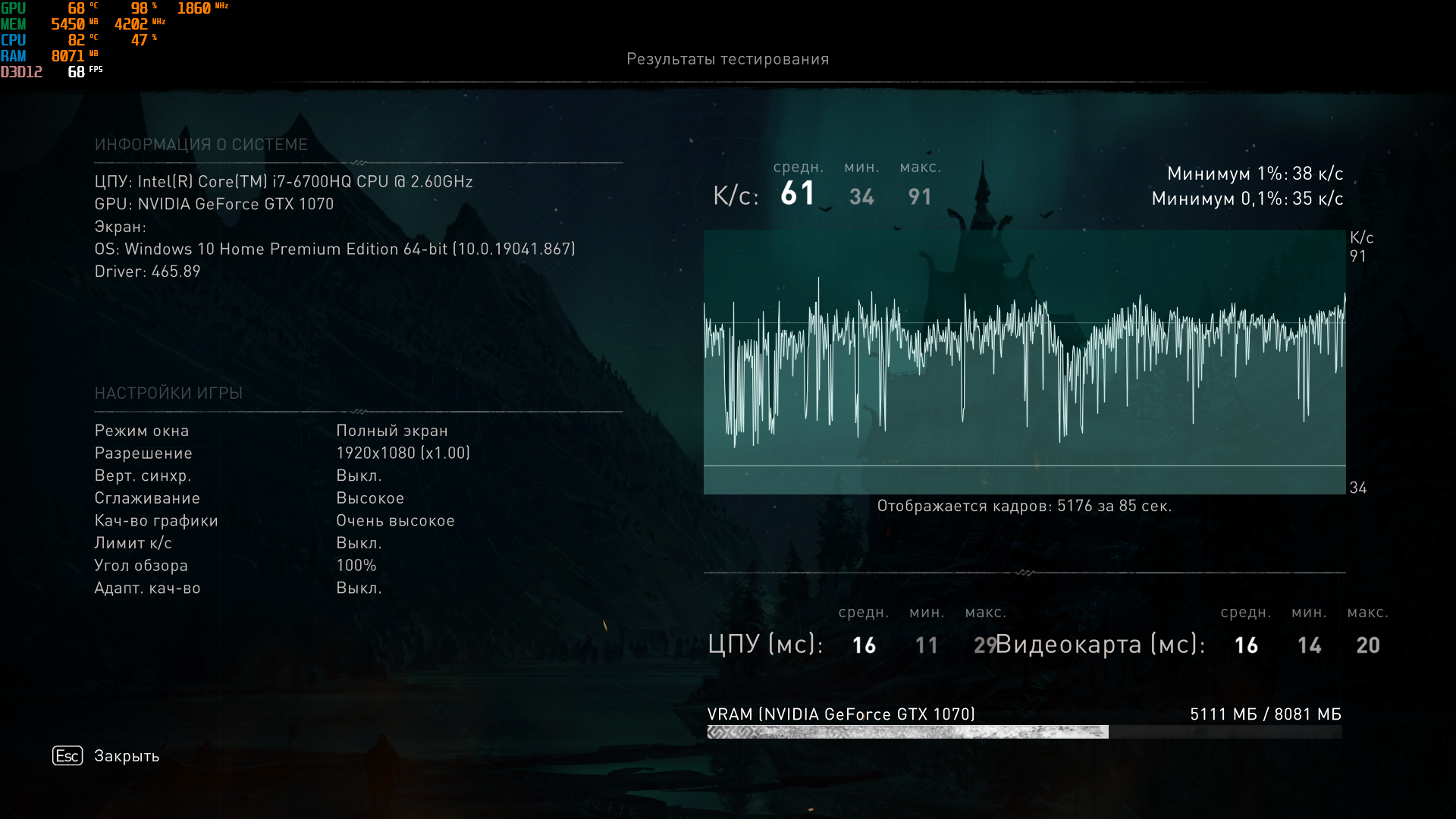 Видяха недогружена, прыгает 94-98% и ей, кажется, не хватает питалова. Ползунки напряжения недоступны. По чипу сделал +100 и память +200, температура нормальная, но она не держит буст по чипу. Короче стоковая 1070, грубо говоря. + медленный ноутбучный Скайлейк с оперативкой 2133Mhz и дефолтными таймингами, что весьма ограничивает видеокарту. (ну и повторяющиеся раз за разом фризы в одних и тех же местах).